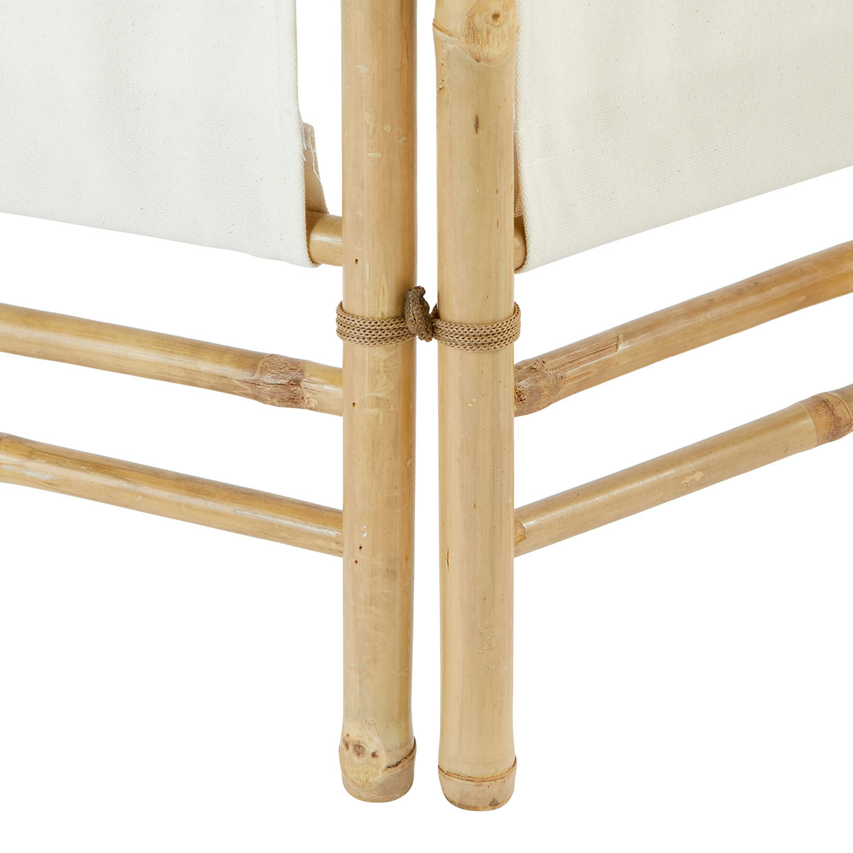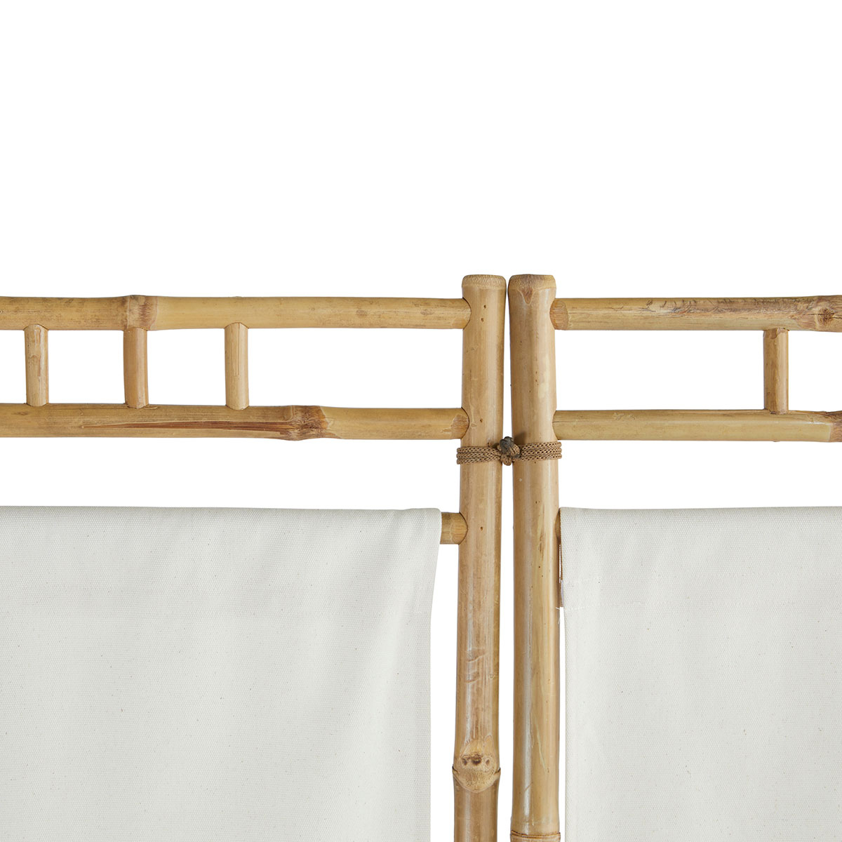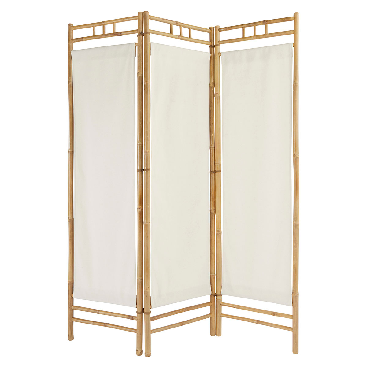 Διαχωριστικό παραβάν για να διαχωρίσετε ή να διακοσμήσετε περιοχές στον χώρο σας. Το πλαίσιο είναι κατασκευασμένο από ξύλο bamboo σε μπεζ χρώμα. Αποτελείται από 3 πάνελ με λευκή υφασμάτινη επιφάνεια, που επιτρέπει στο φως να περάσει ενώ παράλληλα διατηρεί την ιδιωτικότητα σας. Μπορείτε να ρυθμίσετε το μήκος του παραβάν ανάλογα με την έκταση που θέλετε να καταλαμβάνει. Τα υφάσματα είναι αφαιρούμενα και πλενόμενα στο πλυντήριο.