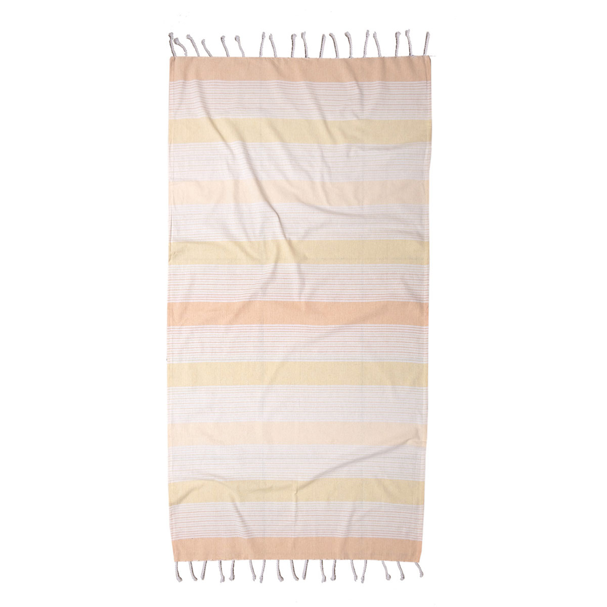 Παρεό σε κίτρινες αποχρώσεις με λευκές-σομόν λεπτομέρειες και ριγέ σχέδιο από την εταιρεία Viopros. Είναι κατασκευασμένο από 100% βαμβάκι και διαθέτει διακοσμητικά κρόσια στο τελείωμα. Ιδανικό για εντυπωσιακές εμφανίσεις στην παραλία.
