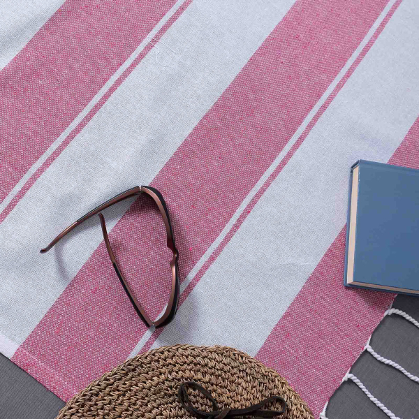 Παρεό θαλάσσης με ριγέ σχέδιο σε ροζ χρώμα και λευκές λεπτομέρειες της εταιρείας Silk Fashion. Διαθέτει κρόσια στο τελείωμα. Το ύφασμα είναι από 100% βαμβάκι βάρους 200gsm. Είναι ιδιαίτερα ανάλαφρο, ανθεκτικό στη χρήση και στεγνώνει γρήγορα.