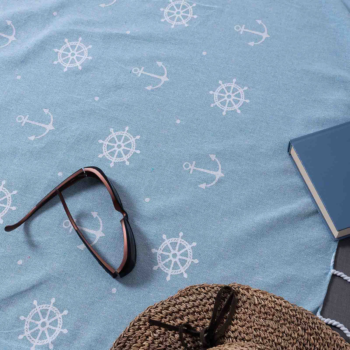 Παρεό θαλάσσης σε γαλάζιο χρώμα με λευκές λεπτομέρειες και μοντέρνο σχέδιο της εταιρείας Silk Fashion. Διαθέτει κρόσια στο τελείωμα. Το ύφασμα είναι από 100% βαμβάκι βάρους 200gsm. Είναι ιδιαίτερα ανάλαφρο, ανθεκτικό στη χρήση και στεγνώνει γρήγορα.
