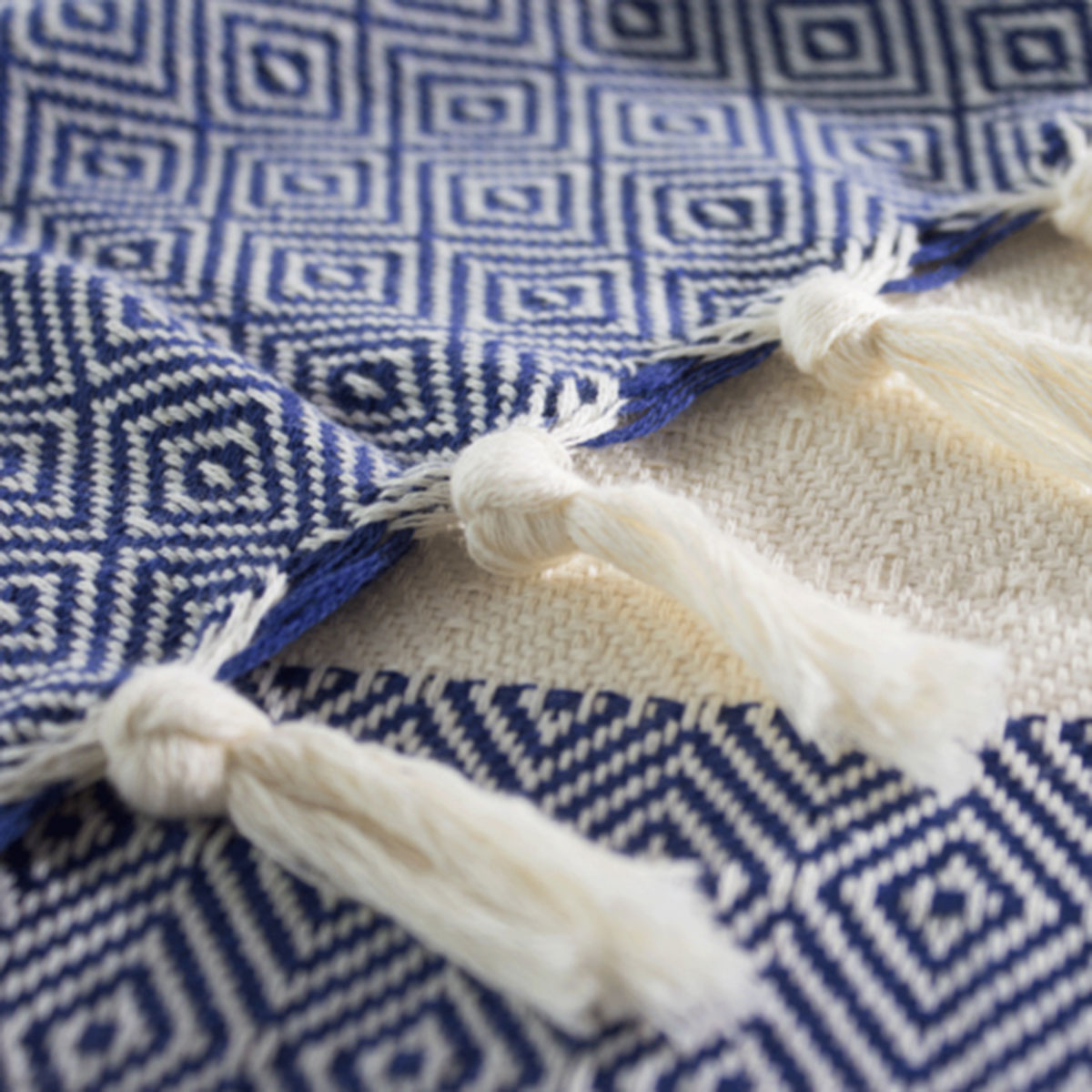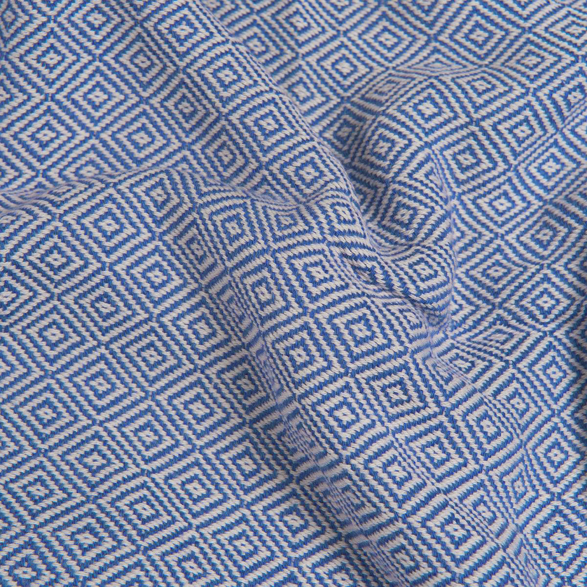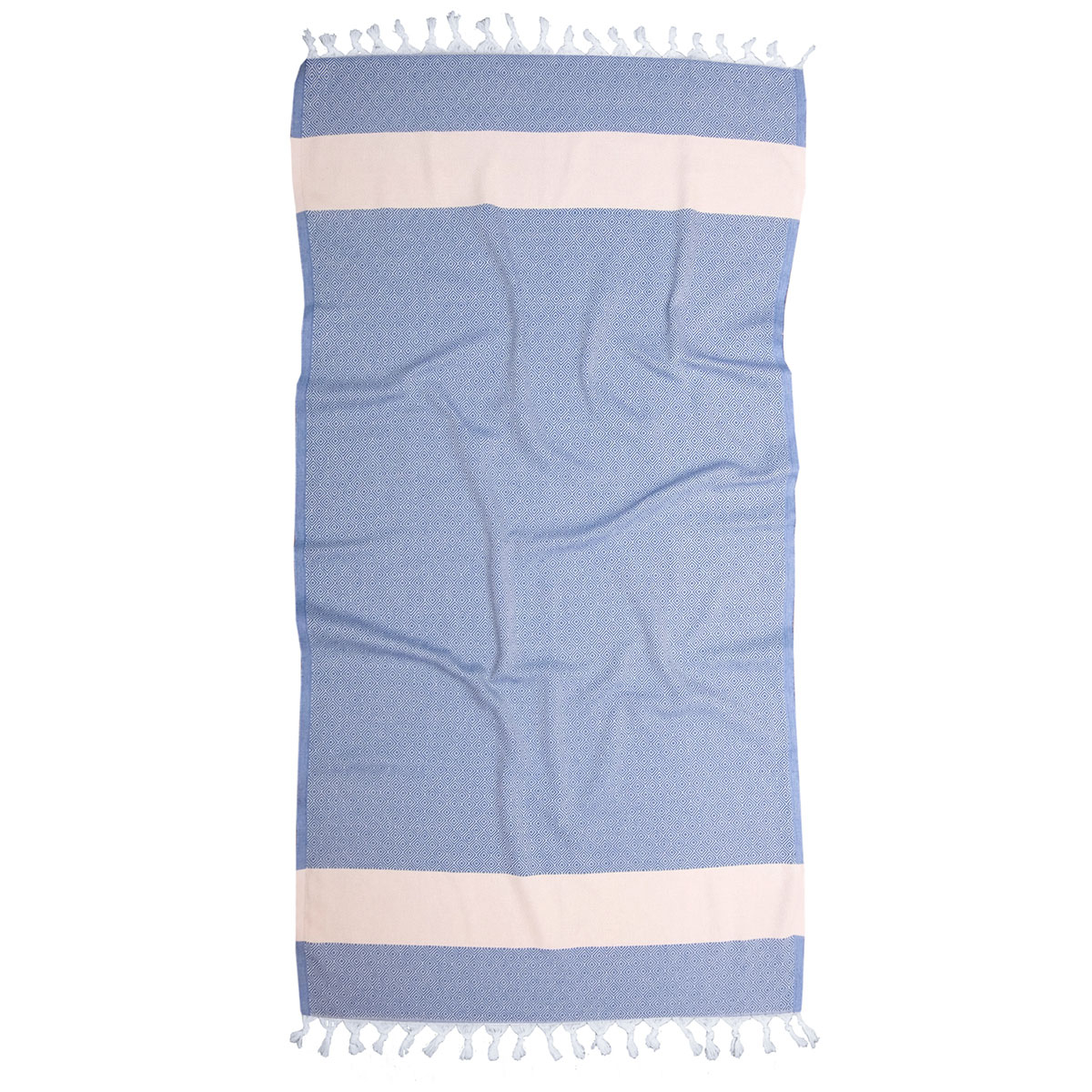 Παρεό για την παραλία σε μπλε χρώμα, με γεωμετρικό σχέδιο και κρόσια στο τελείωμα. Σύνθεση από 100% βαμβακερό ύφασμα. Είναι ιδιαίτερα ανάλαφρο, απαλό και ιδανικό για γρήγορο στέγνωμα.