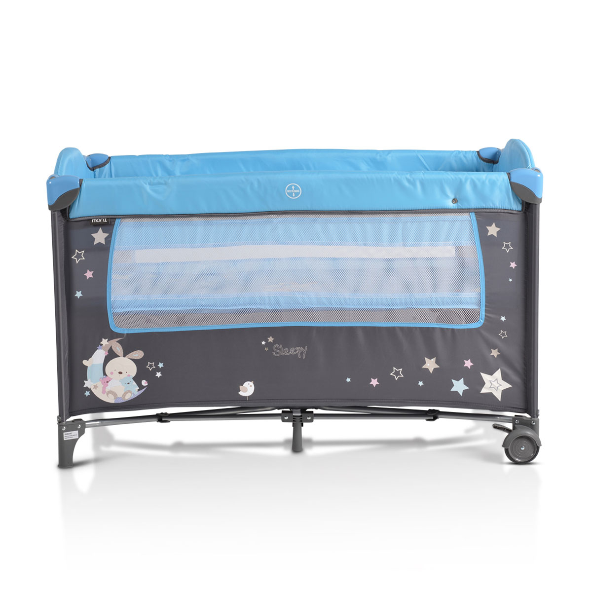 Παρκοκρέβατο Sleepy της εταιρείας Moni σε γκρι-γαλάζιες αποχρώσεις. Κατάλληλο την γέννηση και μέχρι 15 κιλά. Το παρκοκρέβατο αποτελεί τον αγαπημένο χώρο των παιδιών καθώς μπορούν να παίξουν με ασφάλεια, να αναπτύξουν διάφορες δεξιότητες ή να ξεκουραστούν.