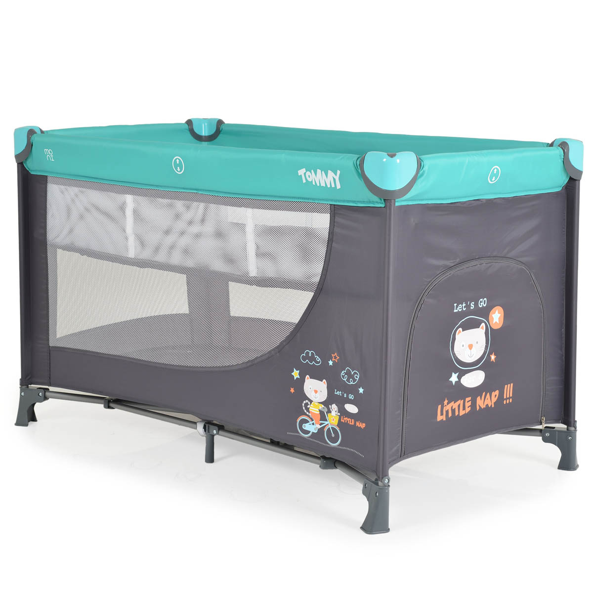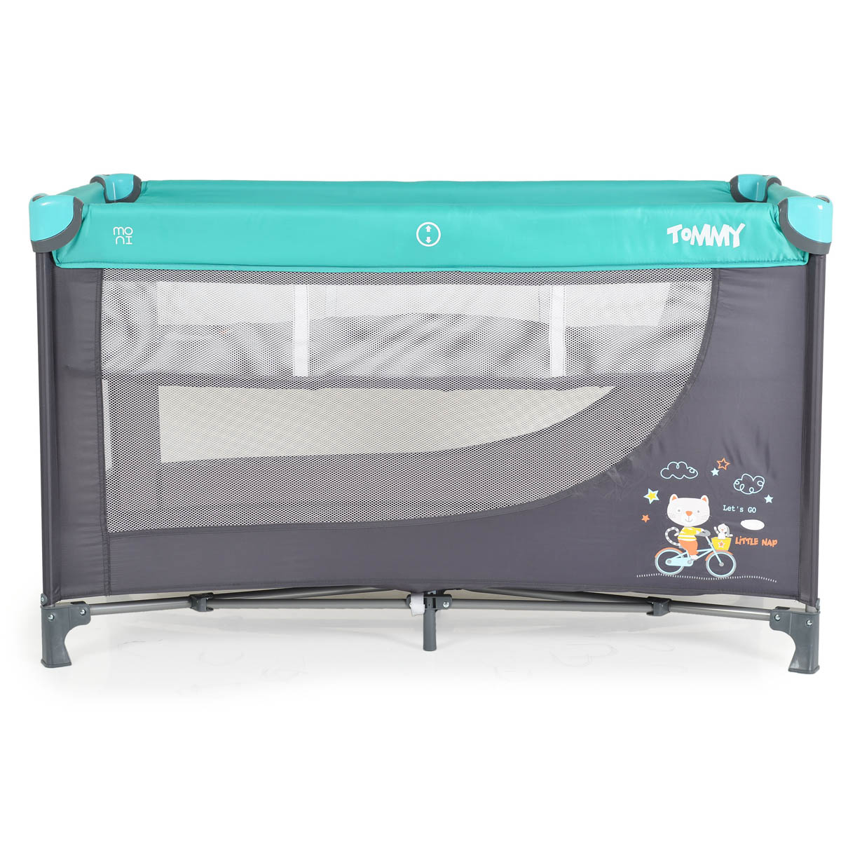 Παρκοκρέβατο Tommy της εταιρείας Moni σε γκρι-τυρκουάζ χρώμα. Κατάλληλο από την γέννηση και μέχρι 14kg. Το παρκοκρέβατο προσφέρει στο παιδί έναν ασφαλή και προστατευμένο χώρο για να ξεκουραστεί ή να παίξει και να αναπτύξει τις δεξιότητές του. Απαιτείται μερική συναρμολόγηση.