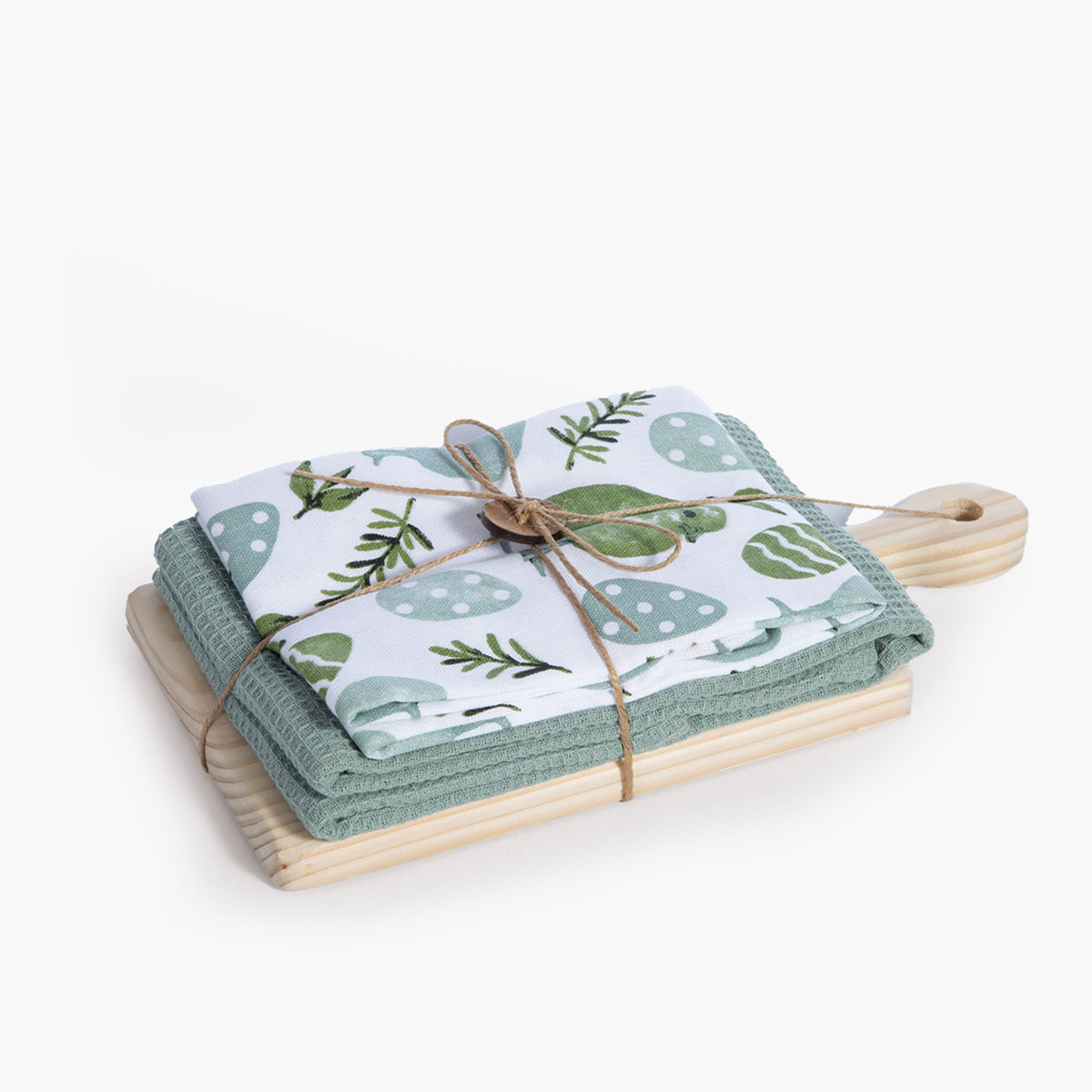 Πασχαλινά ποτηρόπανα με ξύλο κοπής, από την εταιρεία Nef Nef. Τα ποτηρόπανα είναι κατασκευασμένα από 100% βαμβάκι σε βεραμάν χρώμα με λευκές λεπτομέρειες. Έρχεται σε συσκευασία δώρου με ξύλο κοπής σε φυσικό χρώμα. Χρησιμοποιήστε ποτηρόπανα στην κουζίνα για να στεγνώσετε εύκολα και γρήγορα τα πιάτα σας.