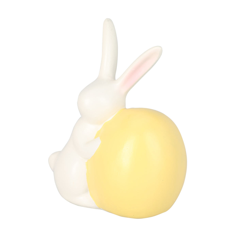 Επιτραπέζια διακοσμητική φιγούρα λαγός σε εκρού χρώμα με κίτρινο αυγό. Είναι κατασκευασμένος από polyresin. Τοποθετήστε τον στο σαλόνι, στην κουζίνα ή όπου αλλού θέλετε να δημιουργήσετε μια πασχαλινή διακόσμηση.