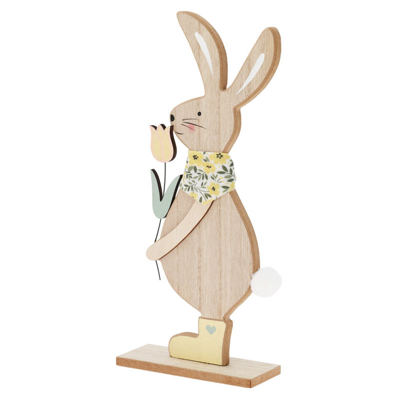 Επιτραπέζια διακοσμητική φιγούρα λαγός. Είναι κατασκευασμένος από ξύλο σε φυσικό χρώμα με κίτρινες-πράσινες λεπτομέρειες. Τοποθετήστε τον στο σαλόνι, στην κουζίνα ή όπου αλλού θέλετε να δημιουργήσετε μια πασχαλινή διακόσμηση.