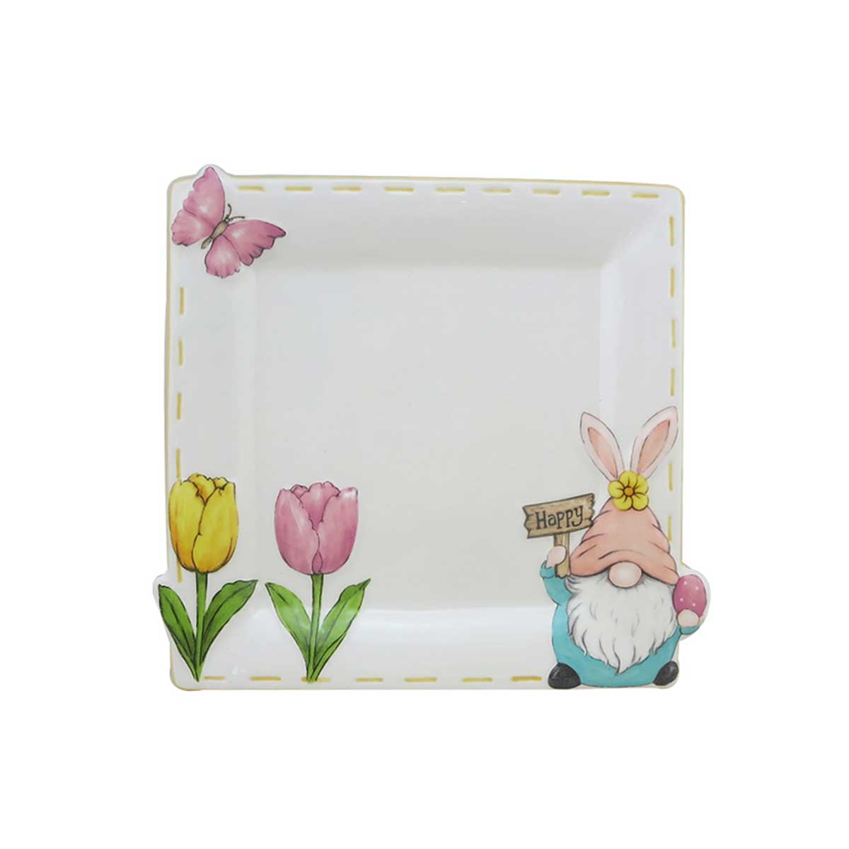 Πασχαλινή πιατέλα σε λευκό χρώμα με πολύχρωμες λεπτομέρειες και σχήμα νάνου από την εταιρεία Marva. Κατασκευασμένη από κεραμικό υλικό. Ιδανική πιατέλα για να τοποθετήσετε και να μεταφέρετε τα πασχαλινά αυγά, τα τσουρέκια ή τα κουλουράκια σας. Συνδυάστε τηνμε τα υπόλοιπα είδη του ίδιου σχεδίου για μια ολοκληρωμένη πασχαλινή διακόσμηση.