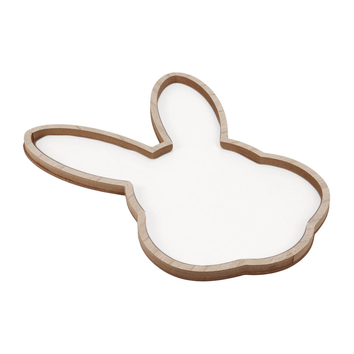 Πασχαλινή πιατέλα με σχήμα λαγού σε λευκό χρώμα και κατασκευασμένη από ξύλο. Ιδανική για να τοποθετήσετε και να μεταφέρετε τα πασχαλινά αυγά, τα τσουρέκια ή τα κουλουράκια σας. Συνδυάστε την με τα υπόλοιπα πασχαλινά διακοσμητικά σας για μια ολοκληρωμένη διακόσμηση.