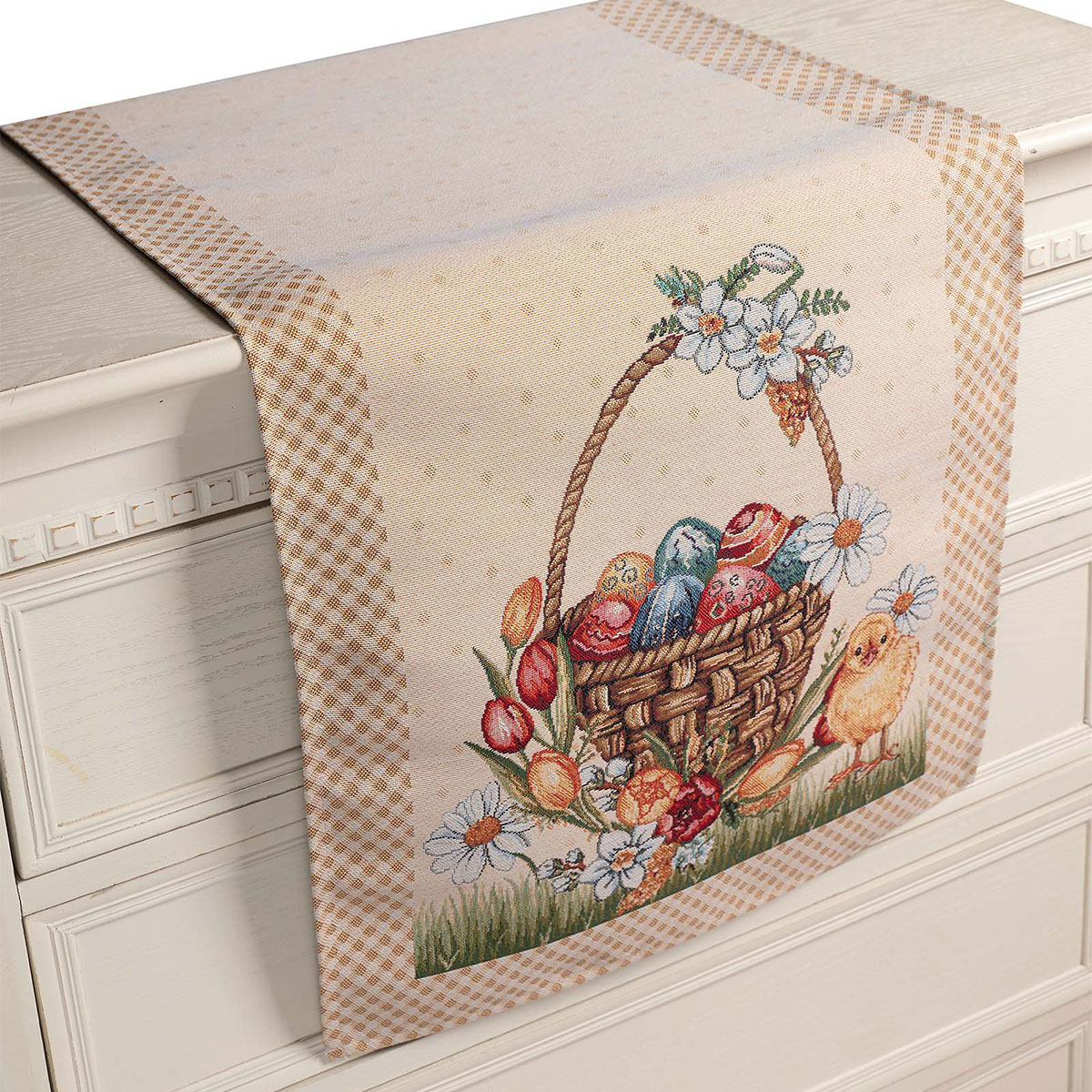 Runner με πασχαλινό σχέδιο σε μπεζ χρώμα, με πολύχρωμες λεπτομέρειες από την εταιρεία Silk Fashion. Πρόκειται για ισπανική στόφα σύνθεσης 80% βαμβάκι 20% polyester. Συνδυάστε τη με τα υπόλοιπα προϊόντα της ίδιας σειράς για μία ολοκληρωμένη πασχαλινή διακόσμηση.