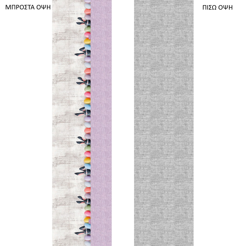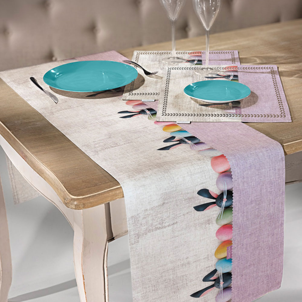 Runner από την εταιρία Saint Clair, σε εκρού-μωβ χρώμα και μοντέρνο σχέδιο. Το ύφασμά της είναι από 100% polyester που το καθιστά ιδανική για καθημερινή χρήση. Η πίσω όψη έχει γκρι απόχρωση. Συνδυάστε το με τα υπόλοιπα είδη του ίδιου σχεδίου για μια ολοκληρωμένη πασχαλινή διακόσμηση.