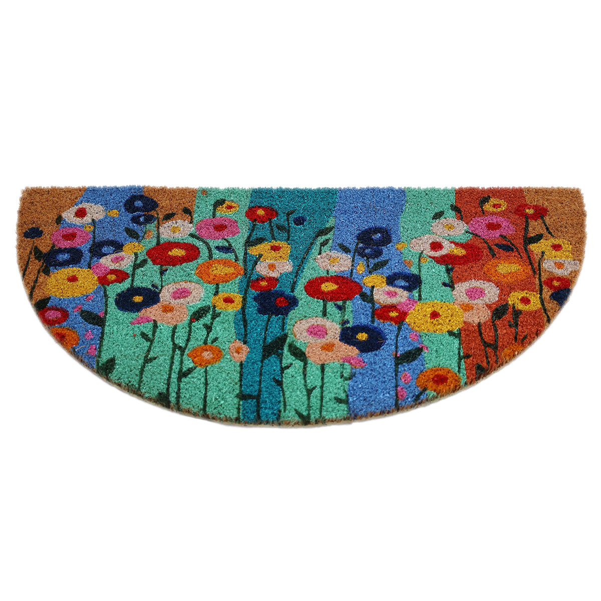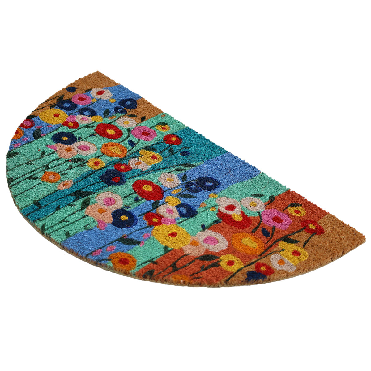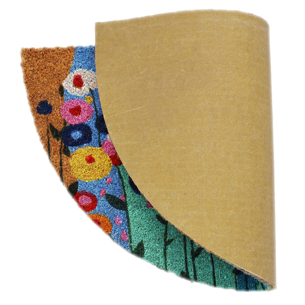 Πατάκι εισόδου ημικυκλικό από την εταιρεία Velcoc με πολύχρωμο φλοράλ σχέδιο. Είναι κατασκευασμένο από κοκοφοίνικα. Έχει χρησιμοποιηθεί ακρυλική βαφή. Διαθέτει αντιολισθητικό υπόστρωμα από βινυλίου. Οι πυκνές ίνες του συγκρατούν σκόνη, λάσπη και βρωμιά. Ιδανικό για χρήση στην είσοδο του σπιτιού ή σε κάποια μπαλκονόπορτα. Πάχος 1.4εκ.