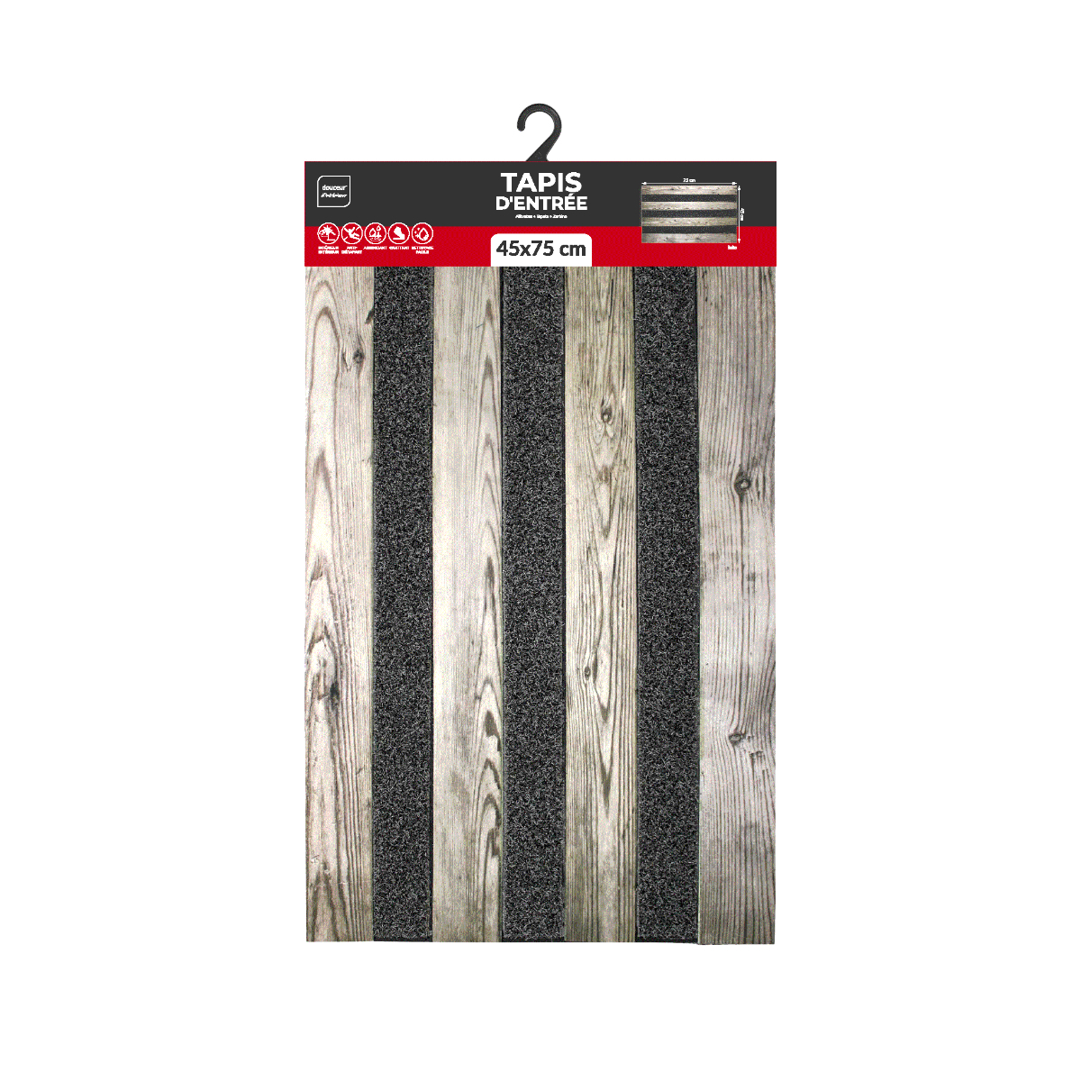 Πατάκι εισόδου με μοντέρνο σχέδιο σε γκρι αποχρώσεις και όψη ξύλου. Έχει βάση από 100% καουτσούκ με μέρη από 100% polyester. Είναι ιδανικό για χρήση στην είσοδο του σπιτιού ή σε κάποια μπαλκονόπορτα.