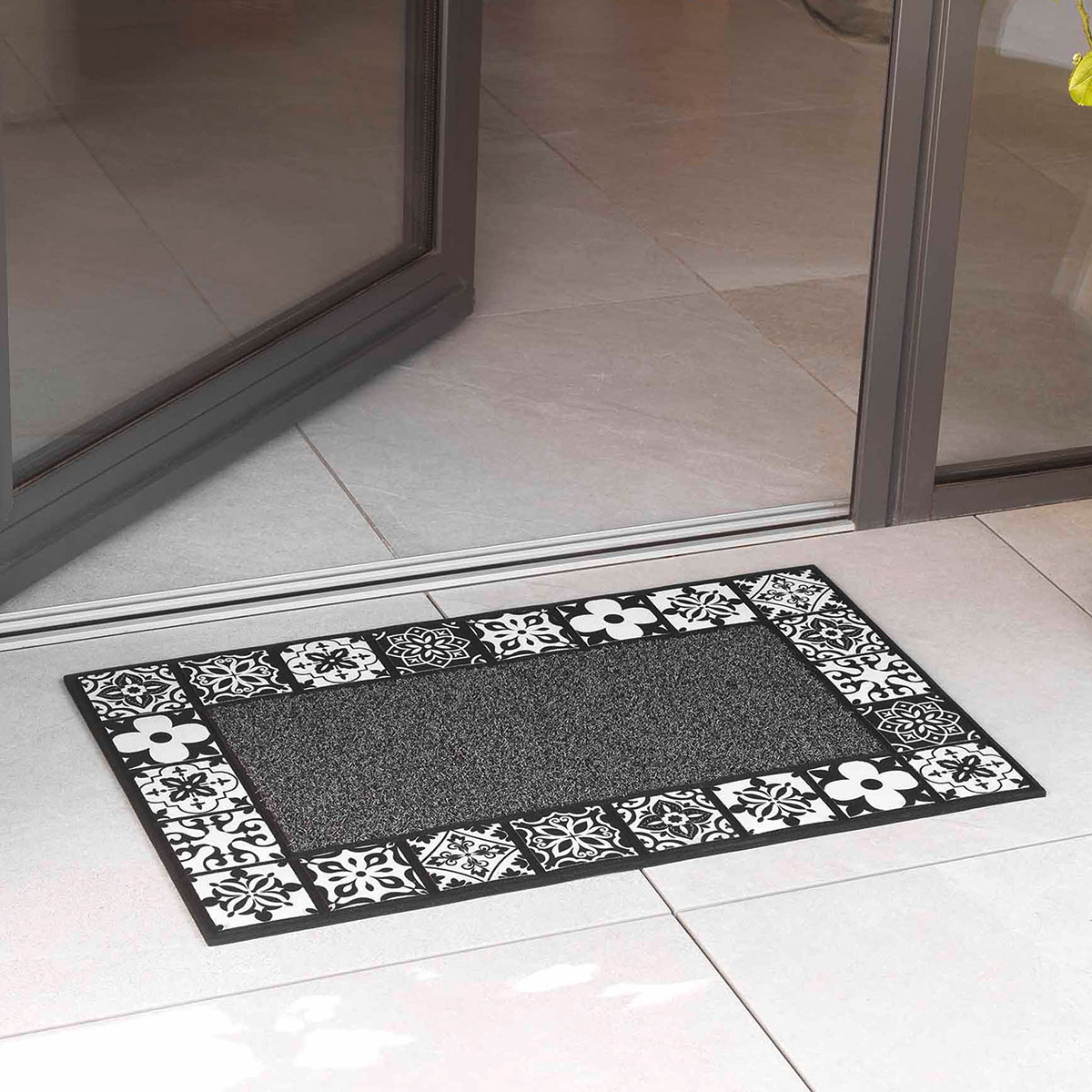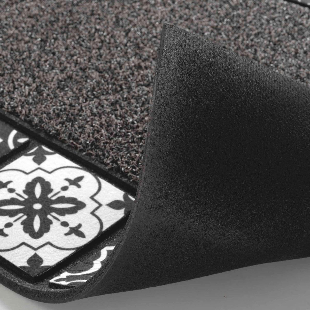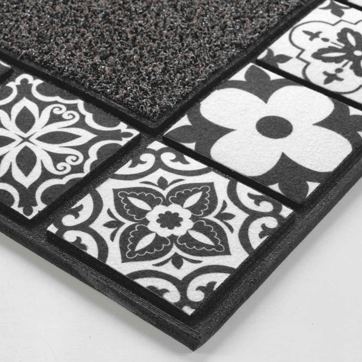 Πατάκι εισόδου με μοντέρνο σχέδιο σε γκρι αποχρώσεις και λευκές-μαύρες λεπτομέρειες. Έχει επιφάνεια από μοκέτα σύνθεσης 100% polyester και βάση από καουτσούκ. Είναι ιδανικό για χρήση στην είσοδο του σπιτιού ή σε κάποια μπαλκονόπορτα.