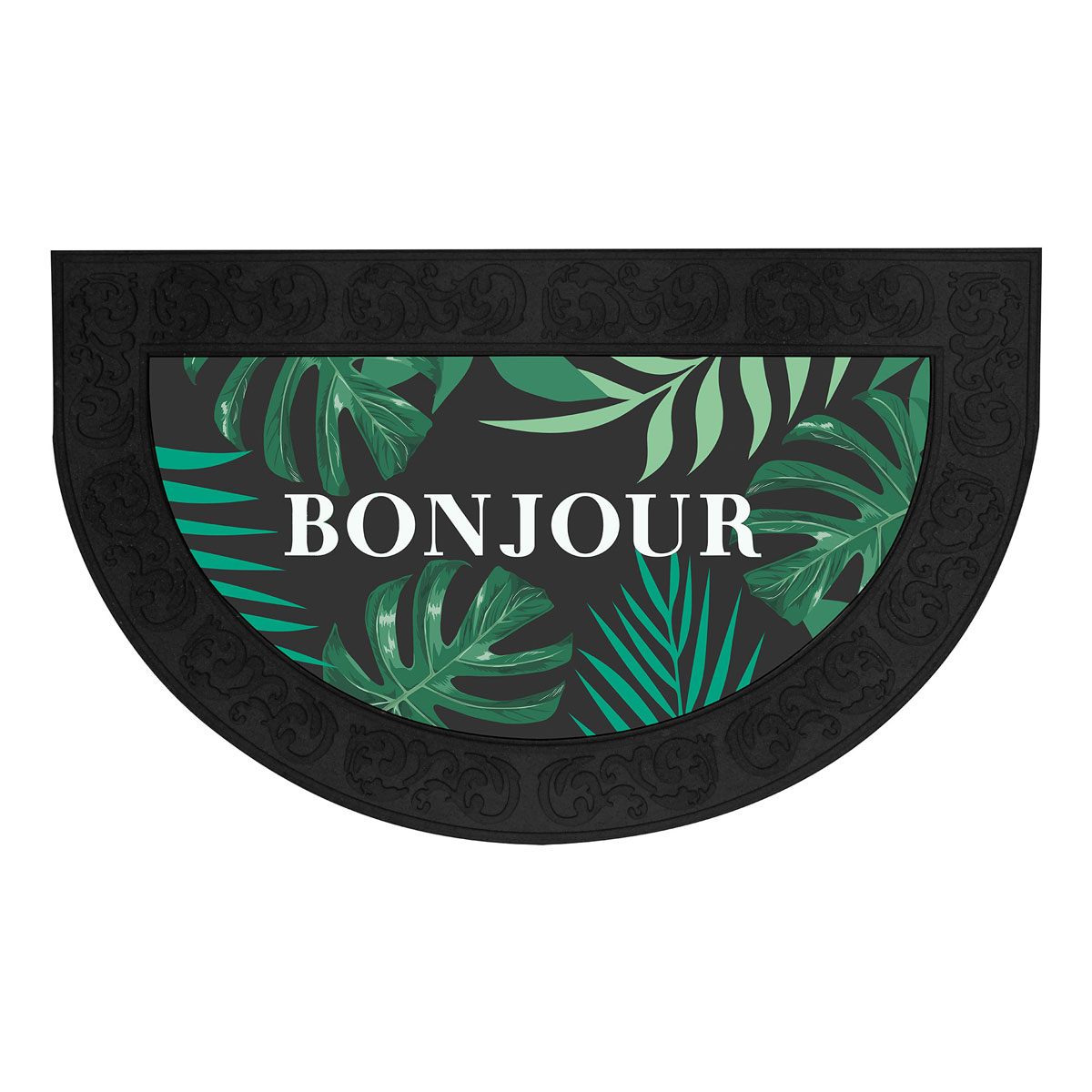 Ημικυκλικό πατάκι εισόδου για χρήση στην είσοδο του σπιτιού ή σε κάποια μπαλκονόπορτα. Είναι κατασκευασμένο από μαύρο καουτσούκ με ανάγλυφη επιφάνεια και τυπωτό tropical σχέδιο.