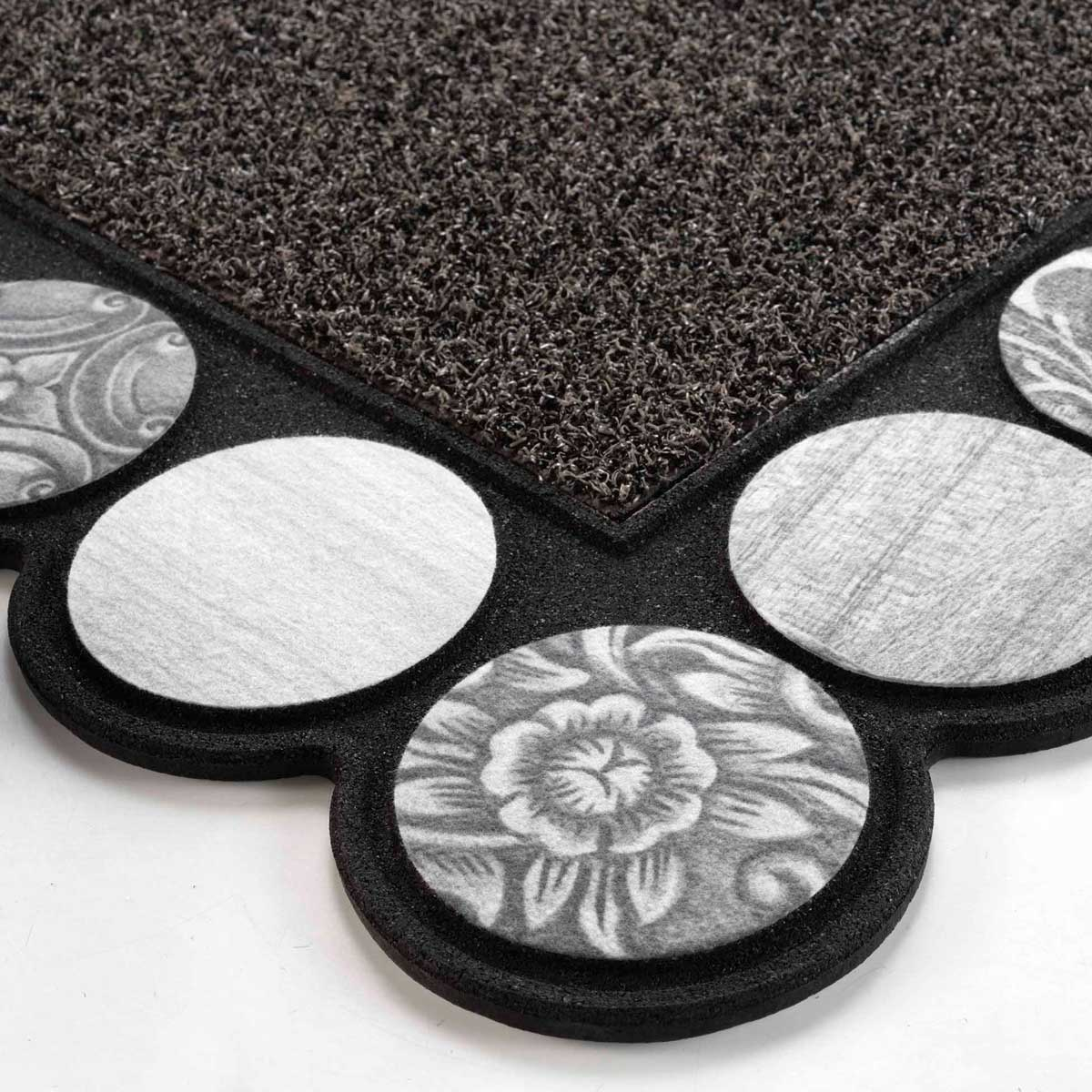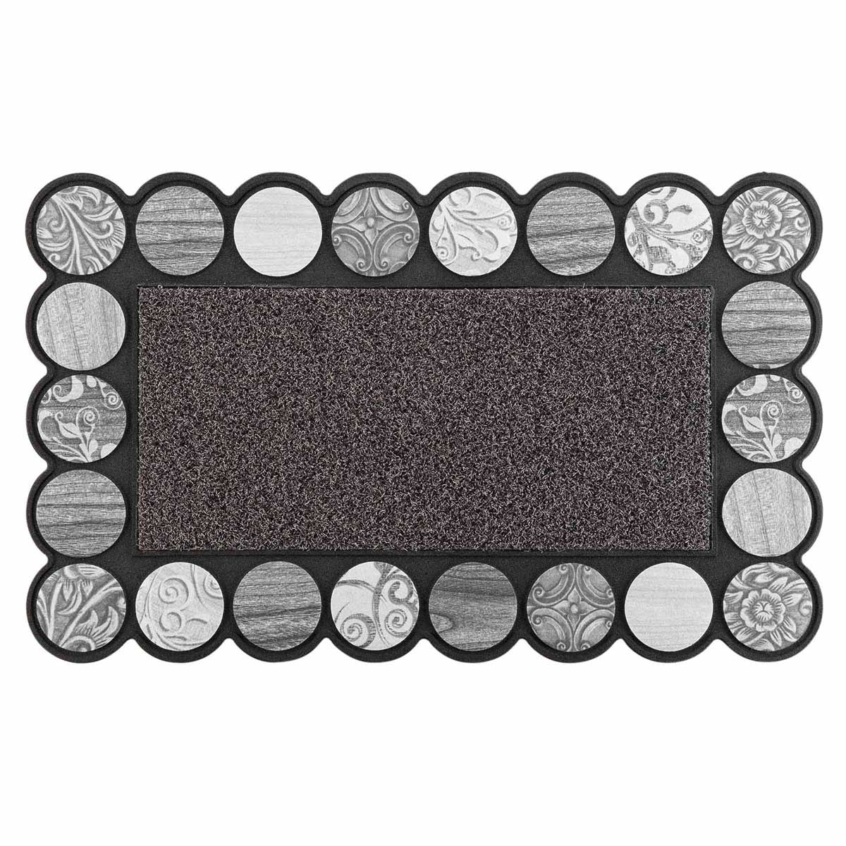 Πατάκι εισόδου με μοντέρνο γκρι σχέδιο περιμετρικά. Η επάνω μεριά είναι κατασκευασμένη από πολυεστερική μοκέτα και η κάτω είναι πλαστικό PVC. Ιδανικό για χρήση στην είσοδο του σπιτιού ή σε κάποια μπαλκονόπορτα.