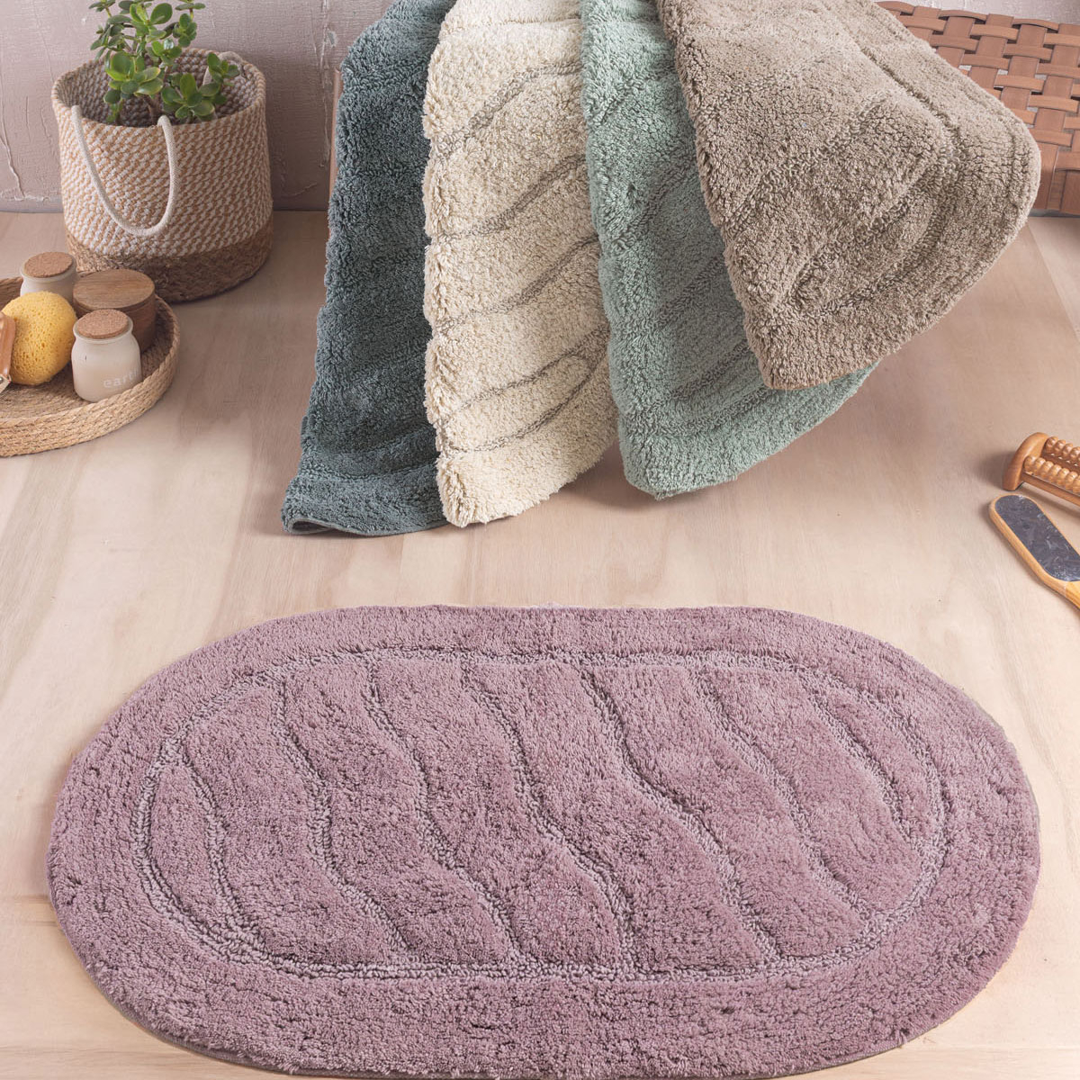 Πατάκι μπάνιου οβάλ από την εταιρεία Rythmos, με ανάγλυφη επιφάνεια, σε 5 αποχρώσεις. Είναι κατασκευασμένο από 100% βαμβάκι, απορροφητικό, με αφράτο πέλος. Χρησιμοποιήστε πατάκι για να ομορφύνετε τον χώρο του μπάνιου και να τον προστατέψετε από νερά.