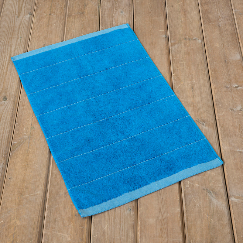 Πατάκι μπάνιου με ριγέ σχέδιο από την εταιρεία Nima σε μπλε χρώμα. Το πετσετέ ύφασμά του έχει σύνθεση από 100% βαμβάκι που το καθιστά ανθεκτικό και απορροφητικό, ιδανικό για τα συγκεντρώνει τα νερά μετά από κάθε μπάνιο.