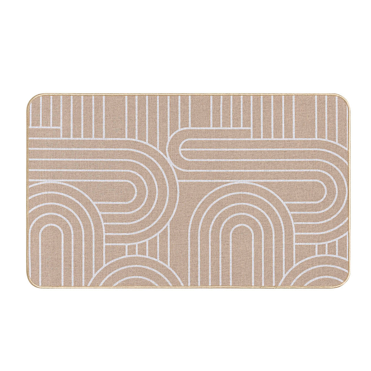 Πατάκι σε μπεζ χρώμα με λευκό τυπωτό γεωμετρικό σχέδιο. Η πάνω πλευρά είναι κατασκευασμένη από 100% polyester, ενώ η κάτω πλευρά είναι από καουτσούκ με αντιολισθητικές ιδιότητες. Καθαρίζεται εύκολα με ηλεκτρική και ρομποτική σκούπα και είναι δανικό για την διακόσμηση της κουζίνας σας.