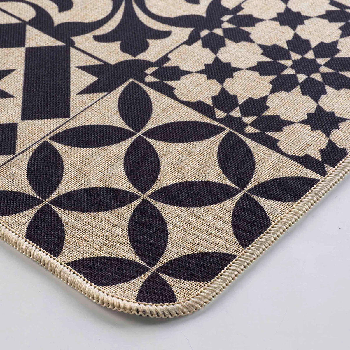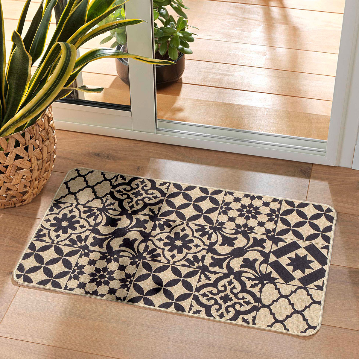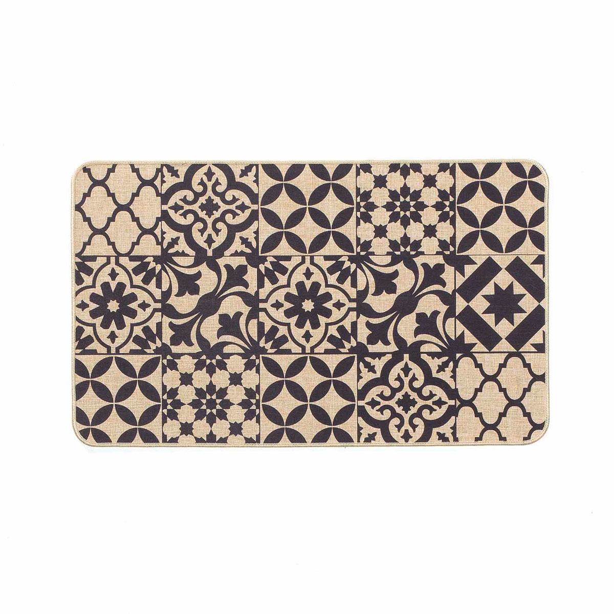 Πατάκι σε μαύρο-μπεζ χρώμα με μοντέρνο τυπωτό σχέδιο. Η πάνω πλευρά είναι κατασκευασμένη από 100% polyester, ενώ η κάτω πλευρά είναι από καουτσούκ με αντιολισθητικές ιδιότητες. Καθαρίζεται εύκολα με ηλεκτρική και ρομποτική σκούπα και είναι ιδανικό για την διακόσμηση της κουζίνας σας.