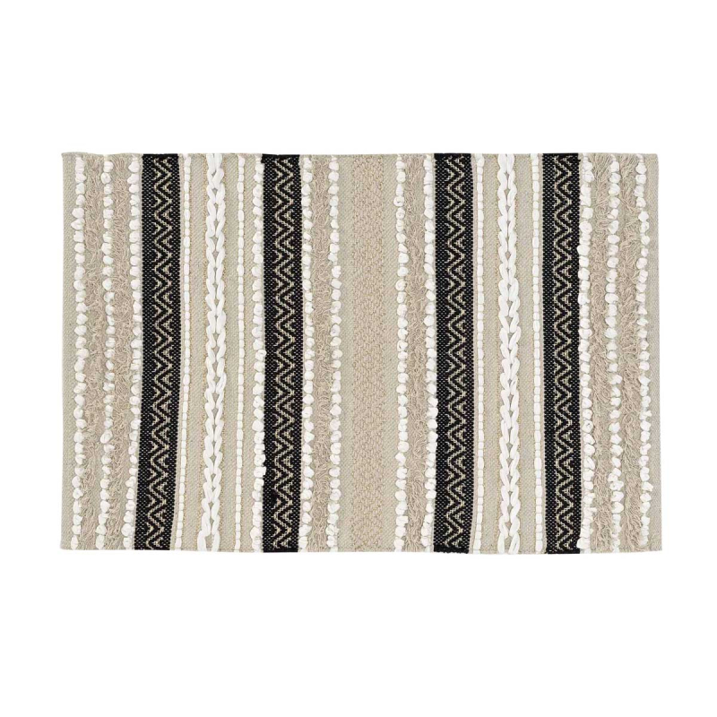 Πατάκι με έθνικ σχέδιο σε μπεζ απόχρωση με μαύρες και μεταλλιζέ λεπτομέρειες. Είναι κατασκευασμένο από 54% Βαμβάκι-36% Polyester-10% Άλλες Ίνες. Συνδυάστε το με το ύφος του χώρου σας και ανανεώστε την διακόσμησή του.