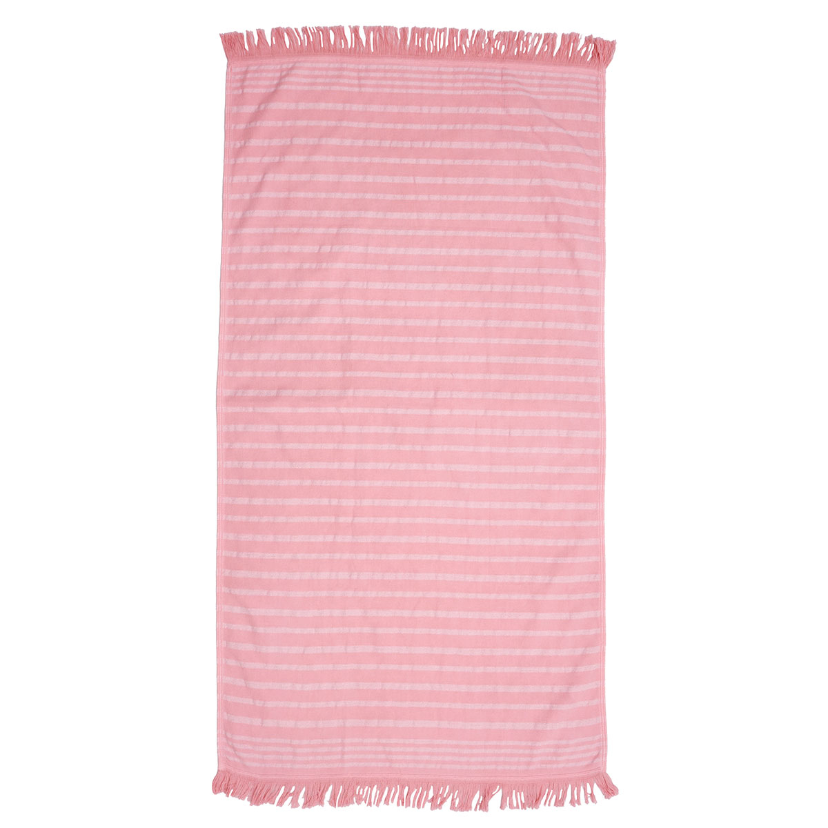 Πετσέτα θαλάσσης - παρεό σε ροζ χρώμα με ριγέ σχέδιο από την εταιρεία Anna Riska. Είναι κατασκευασμένη από 100% βαμβάκι με την μία όψη του να είναι υφασμάτινη, που την κάνει ιδιαίτερα απαλή, και η άλλη πετσετέ για απορροφητικότητα. Είτε τυλιχτείτε είτε τη στρώσετε στην ξαπλώστρα σας, θα σας είναι απαραίτητη στις διακοπές σας και θα τραβήξει όλα τα μάτια πάνω σας.