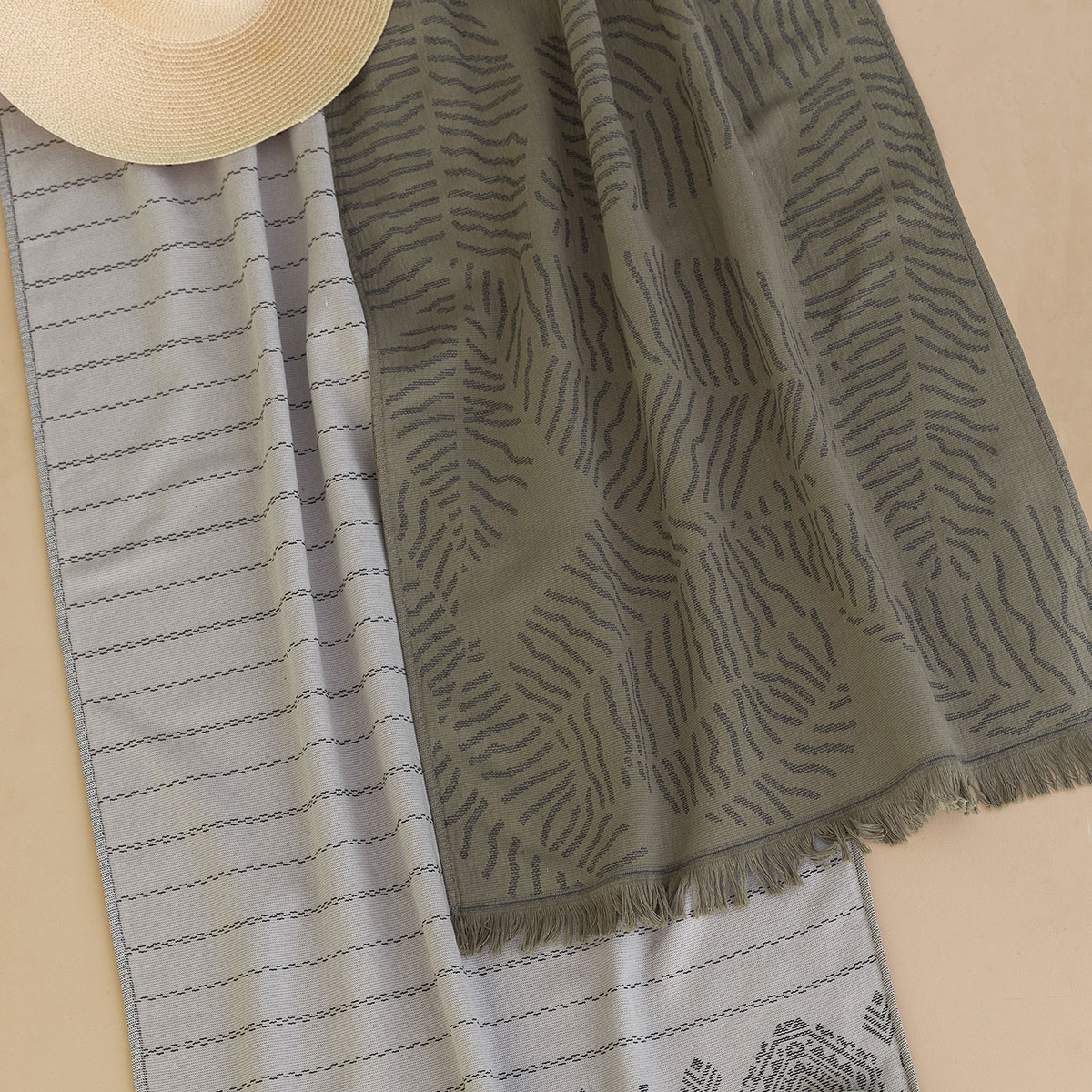 Πετσέτα θαλάσσης - παρεό σε χακί χρώμα με φλοράλ σχέδιο και μαύρες λεπτομέρειες από την εταιρεία Palamaiki. Είναι κατασκευασμένη από 100% βαμβάκι με την μία όψη του να είναι υφασμάτινη, που την κάνει ιδιαίτερα απαλή, και η άλλη πετσετέ για απορροφητικότητα. Είτε τυλιχτείτε είτε τη στρώσετε στην ξαπλώστρα σας, θα σας είναι απαραίτητη στις διακοπές σας και θα τραβήξει όλα τα βλέμματα πάνω σας.