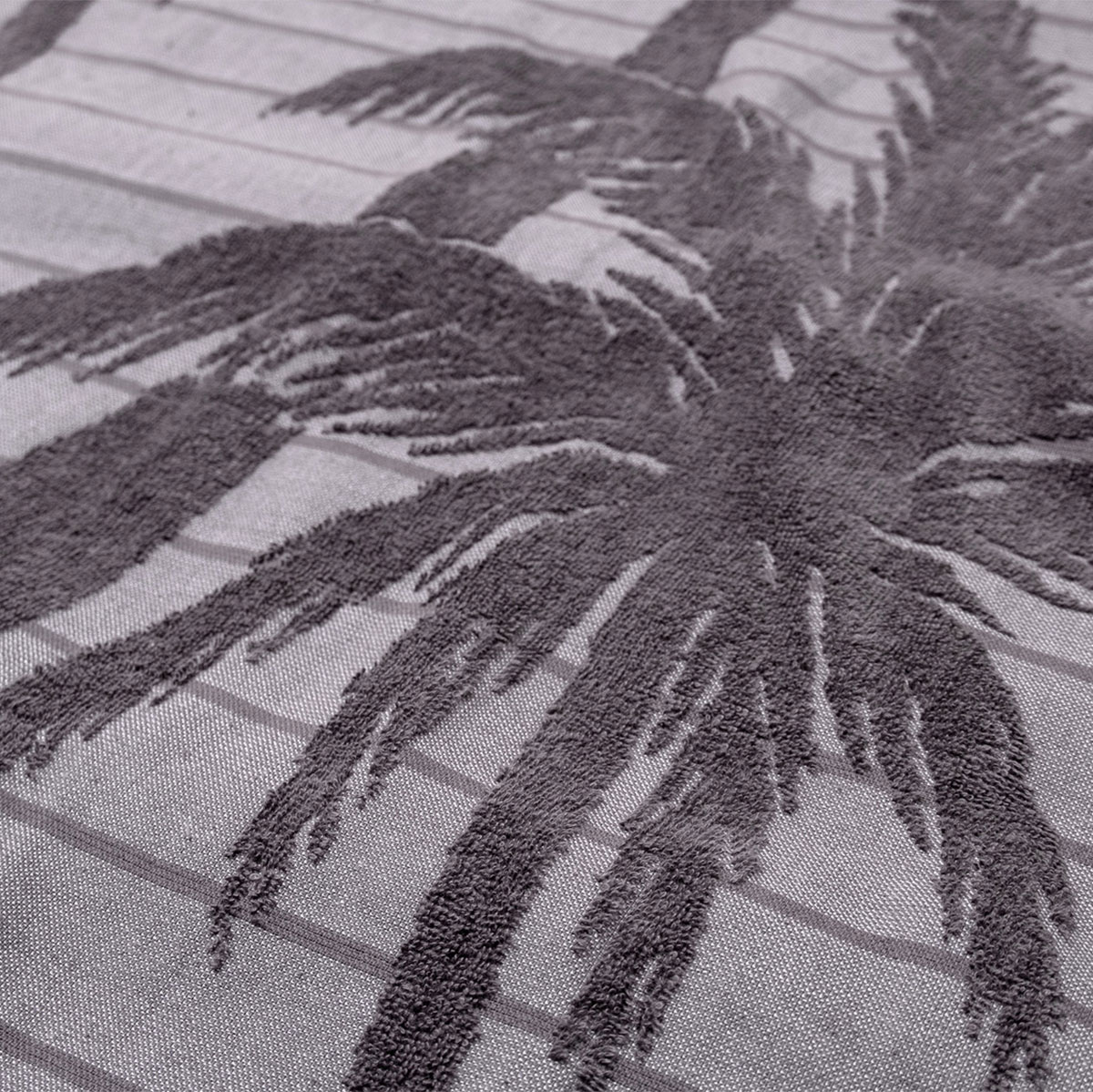 Πετσέτα θαλάσσης - παρεό σε γκρι αποχρώσεις με tropical σχέδιο από την εταιρεία Anna Riska. Είναι κατασκευασμένη από 100% βαμβάκι με την μία πλευρά του να είναι υφασμάτινη ενώ η άλλη πλευρά είναι πετσετέ που την καθιστά ιδιαίτερα απορροφητική. Είτε τυλιχτείτε είτε τη στρώσετε στην ξαπλώστρα σας, θα είναι απαραίτητη στις διακοπές σας και θα τραβήξει όλα τα μάτια πάνω σας.