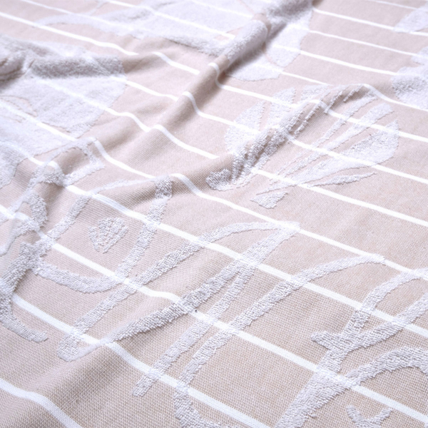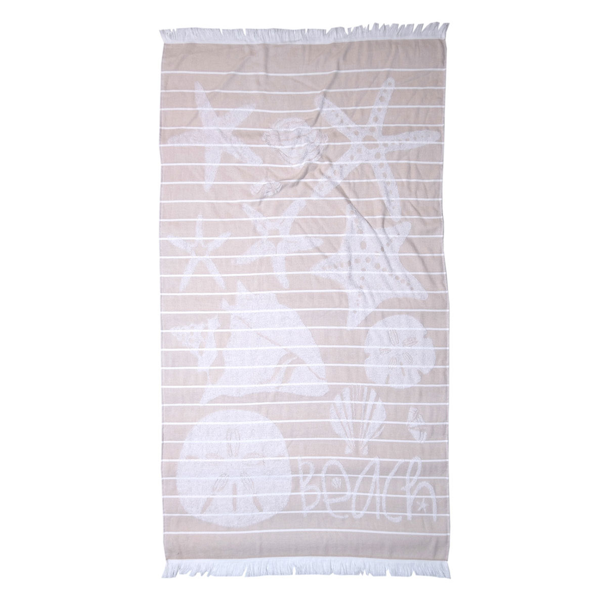 Πετσέτα θαλάσσης - παρεό με καλοκαιρινό σχέδιο σε μπεζ χρώμα και εκρού λεπτομέρειες από την εταιρεία Anna Riska. Είναι κατασκευασμένη από 100% βαμβάκι με την μία πλευρά του να είναι υφασμάτινη ενώ η άλλη πλευρά είναι πετσετέ που την καθιστά ιδιαίτερα απορροφητική. Είτε τυλιχτείτε είτε τη στρώσετε στην ξαπλώστρα σας, θα είναι απαραίτητη στις διακοπές σας και θα τραβήξει όλα τα μάτια πάνω σας.