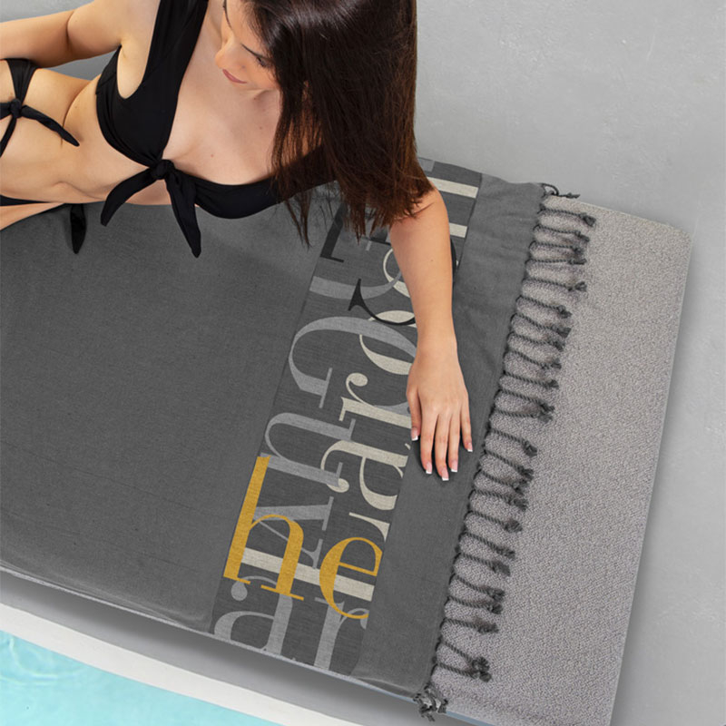 Πετσέτα - παρεό θαλάσσης σε σκούρο γκρι χρώμα με εκρού-κίτρινες λεπτομέρειες και κρόσια από την εταιρεία Guy Laroche. Σύνθεση από 100% βαμβάκι με την επάνω πλευρά να είναι ύφασμα ενώ η κάτω πλευρά πετσετέ. Ιδανική επιλογή καθώς είναι απορροφητική ενώ στεγνώνει εύκολα και γρήγορα.