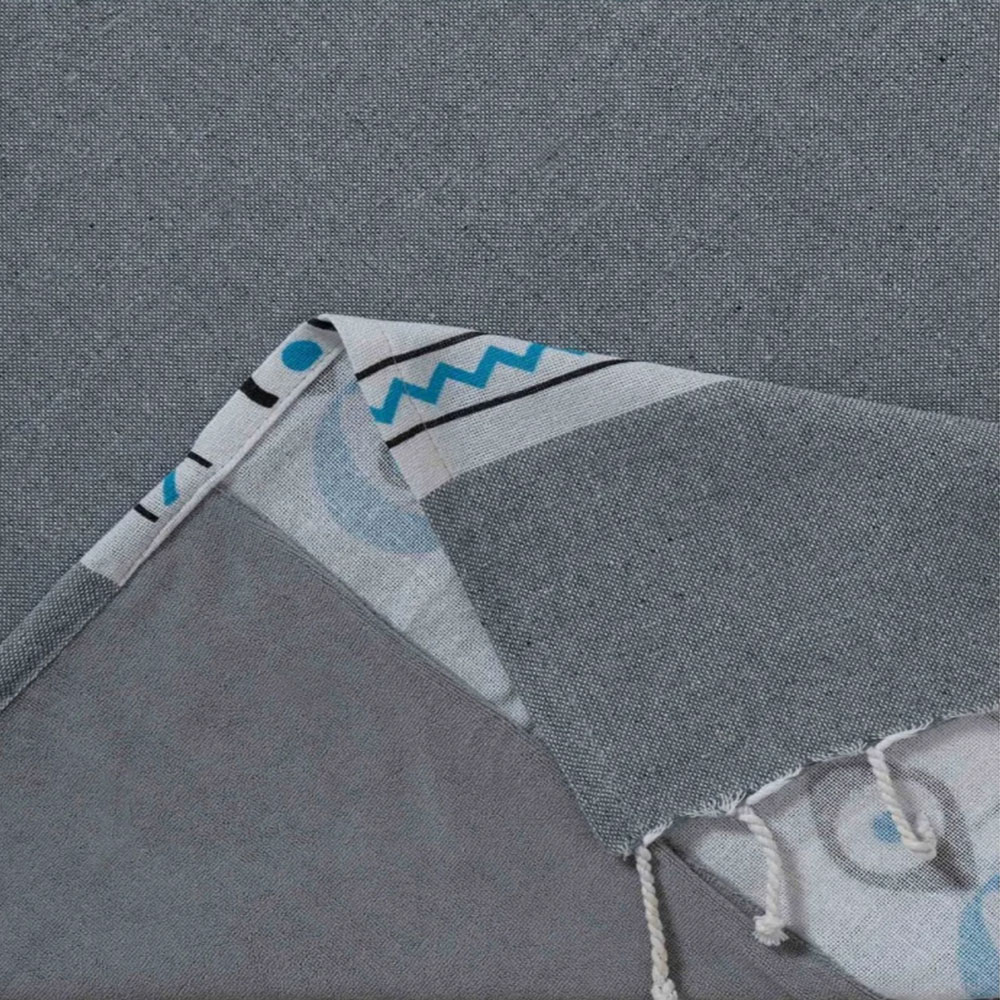 Πετσέτα - παρεό θαλάσσης σε γκρι χρώμα με λευκές λεπτομέρειες και μοντέρνο σχέδιο. Διαθέτει κρόσσια στο τελείωμα. Το ύφασμα είναι από 100% βαμβάκι που τη καθιστά ιδιαίτερα ανάλαφρη. Η μία πλευρά είναι υφασμάτινη και η άλλη πετσετέ. Ιδανική καλοκαιρινή επιλογή καθώς είναι απορροφητική και στεγνώνει γρήγορα και εύκολα.