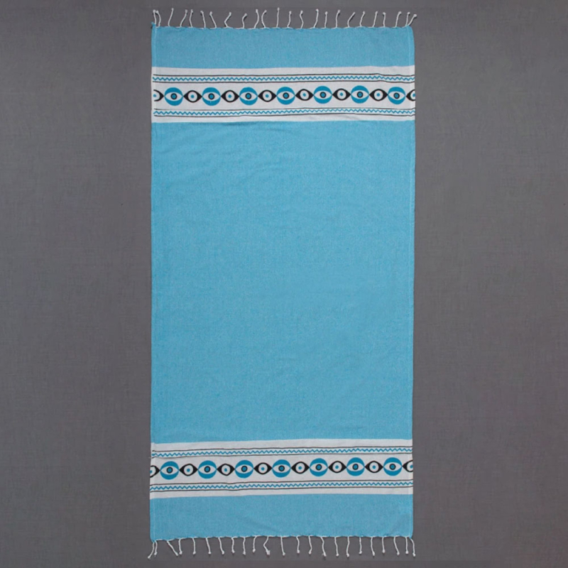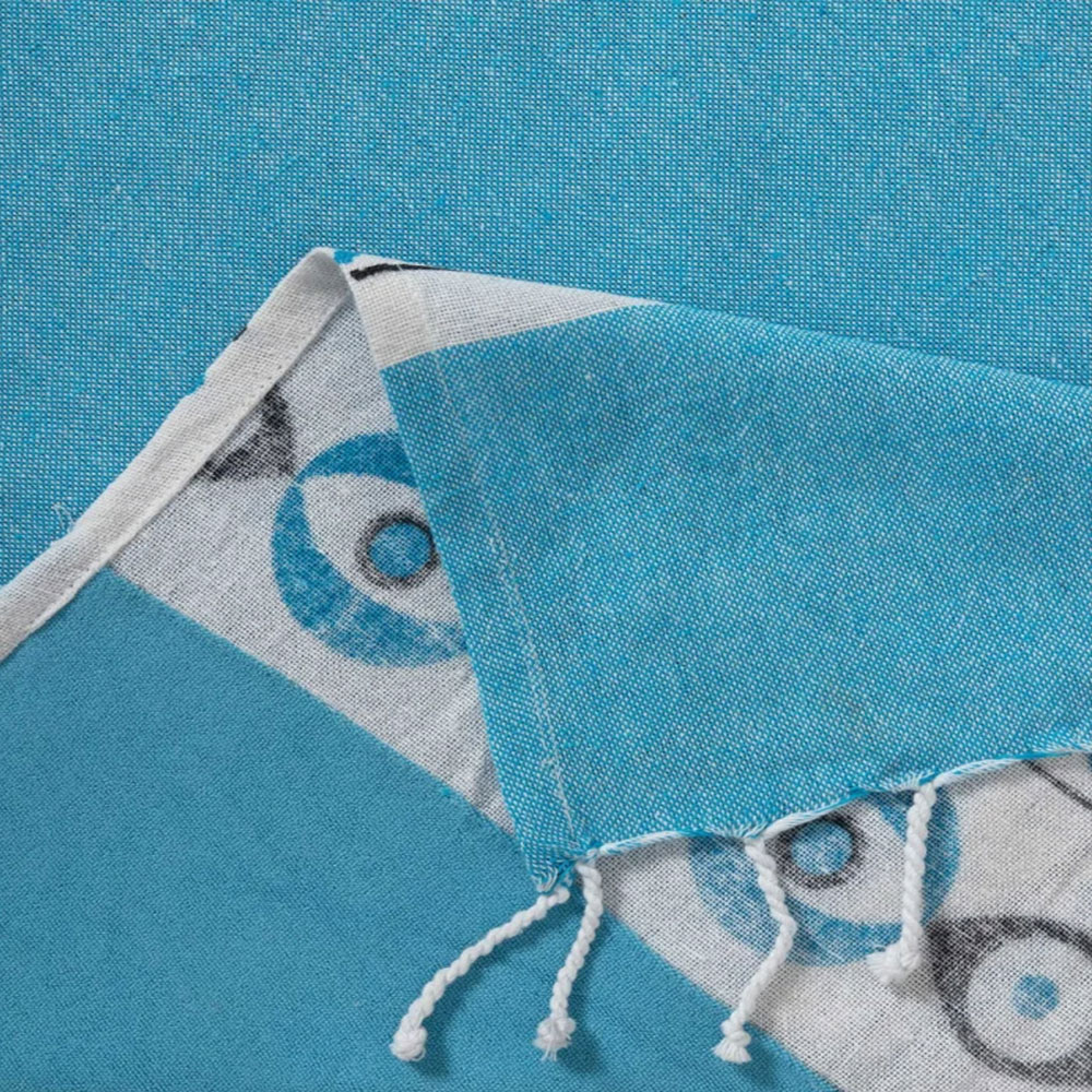 Πετσέτα - παρεό θαλάσσης σε τυρκουάζ χρώμα με λευκές λεπτομέρειες και μοντέρνο σχέδιο. Διαθέτει κρόσσια στο τελείωμα. Το ύφασμα είναι από 100% βαμβάκι που τη καθιστά ιδιαίτερα ανάλαφρη. Η μία πλευρά είναι υφασμάτινη και η άλλη πετσετέ. Ιδανική καλοκαιρινή επιλογή καθώς είναι απορροφητική και στεγνώνει γρήγορα και εύκολα.