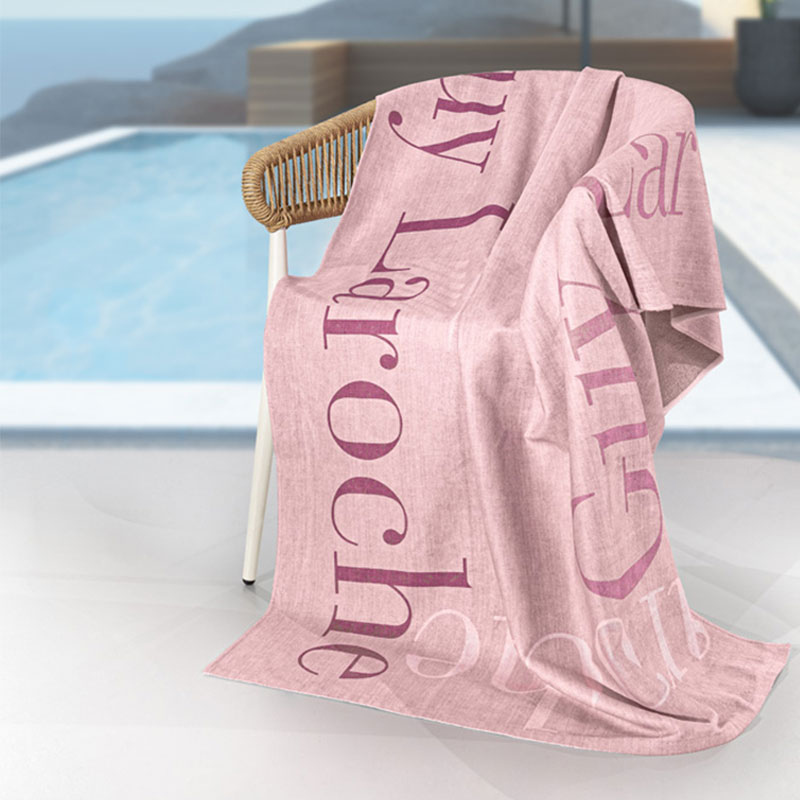 Πετσέτα θαλάσσης σε ροζ αποχρώσεις και μοντέρνο σχέδιο τυπωμένο με την μέθοδο της ψηφιακής εκτύπωσης από την εταιρεία Guy Laroche. Με βελουτέ ύφασμα από 50% βαμβάκι-50% polyester που την κάνει αρκετά απαλή και απορροφητική.