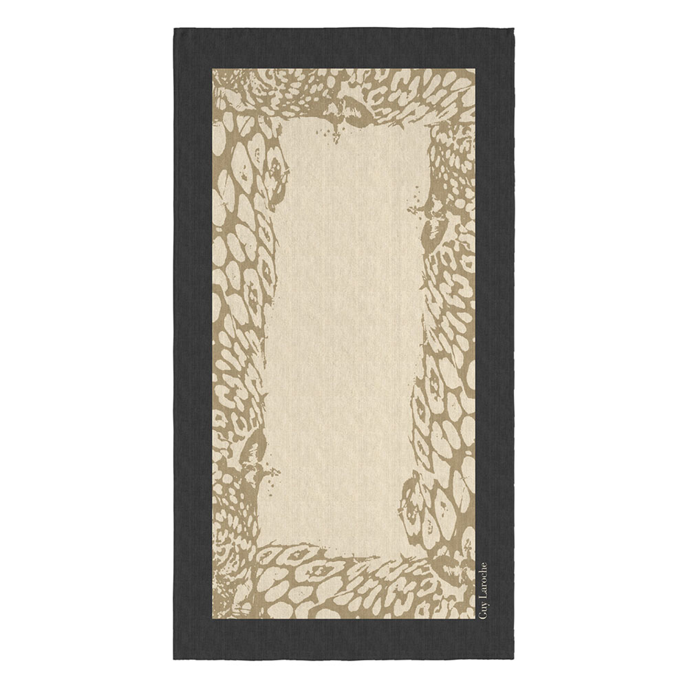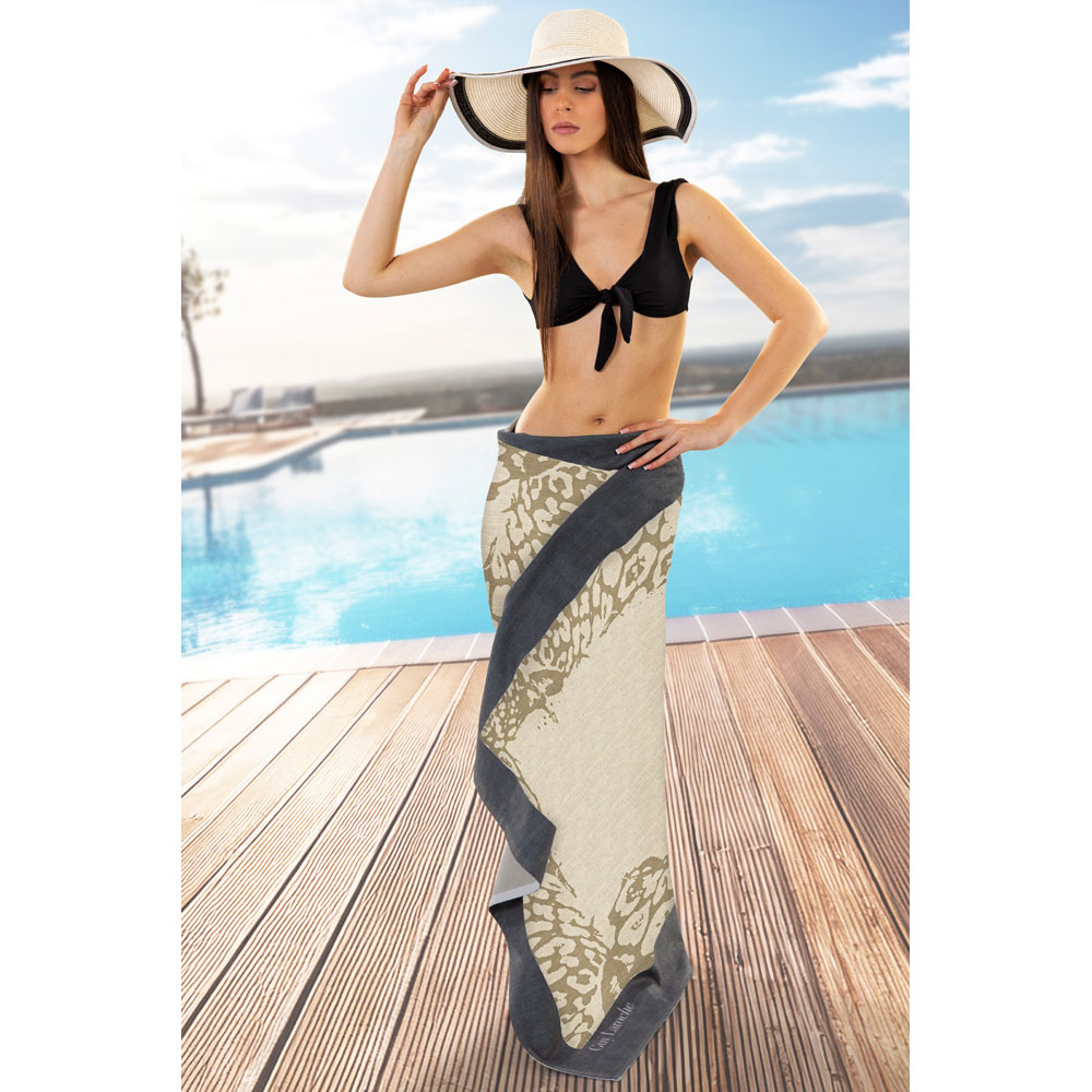 Πετσέτα θαλάσσης με μοντέρνο σχέδιο τυπωμένο με την μέθοδο της ψηφιακής εκτύπωσης, σε μπεζ αποχρώσεις και μαύρες λεπτομέρειες από την εταιρεία Guy Laroche. Το ύφασμα είναι βελουτέ από 50% βαμβάκι-50% polyester που κάνει την πετσέτα αρκετά απαλή και απορροφητική.