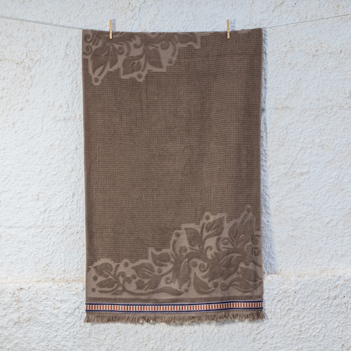 Πετσέτα θαλάσσης από την εταιρεία White Fabric σε καφέ χρώμα με φλοράλ σχέδιο. Διαθέτει υφαντή φάσα και διακοσμητικά κρόσσια στο τελείωμα. Είναι κατασκευασμένη από 100% βαμβάκι βάρους 450gsm. Η σύνθεσή της τη καθιστά ιδιαίτερα απαλή και απορροφητική. Επίσης, το βαμβακερό ύφασμα είναι φιλικό στο δέρμα. Μοναδική πετσέτα με ποιότητα και στυλ για τις εμφανίσεις σας στην παραλία.