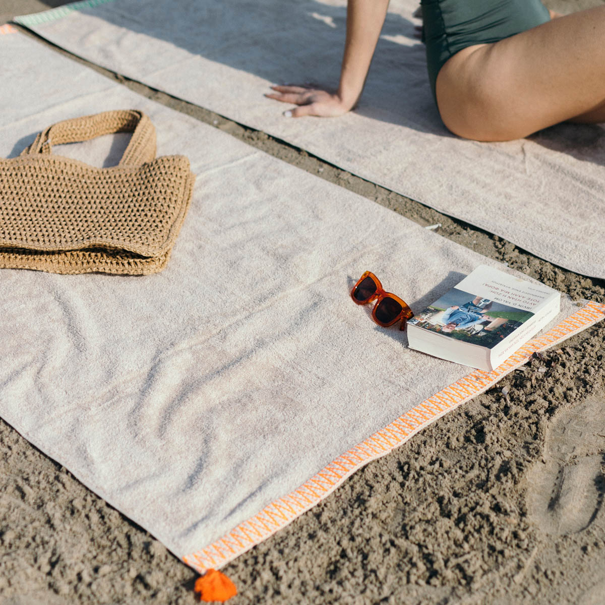 Πετσέτα θαλάσσης από την εταιρεία White Fabric. Έχει εκρού χρώμα, υφασμάτινη φάσα σε πορτοκαλί-λευκό χρώμα και πορτοκαλί φουντίτσες στις άκρες. Η σύνθεσή της από 100% εξαιρετικό βαμβακερό ύφασμα, βάρους 480gsm, την καθιστά πολύ απαλή και απορροφητική.