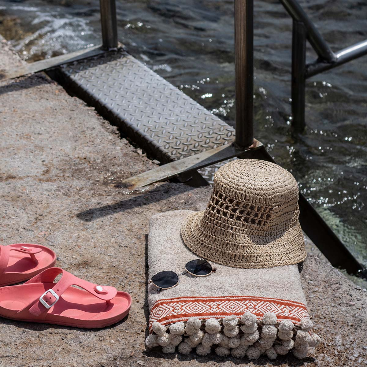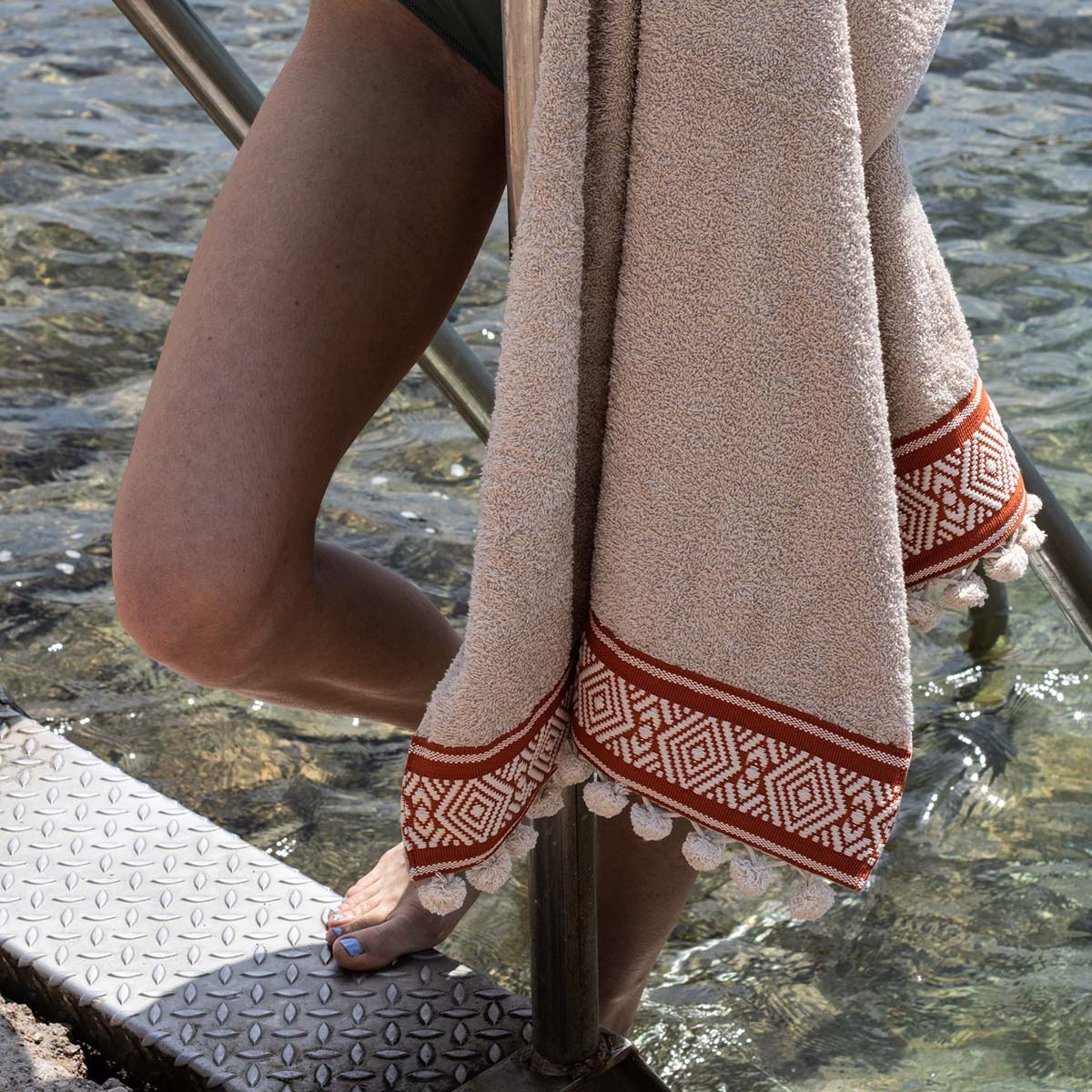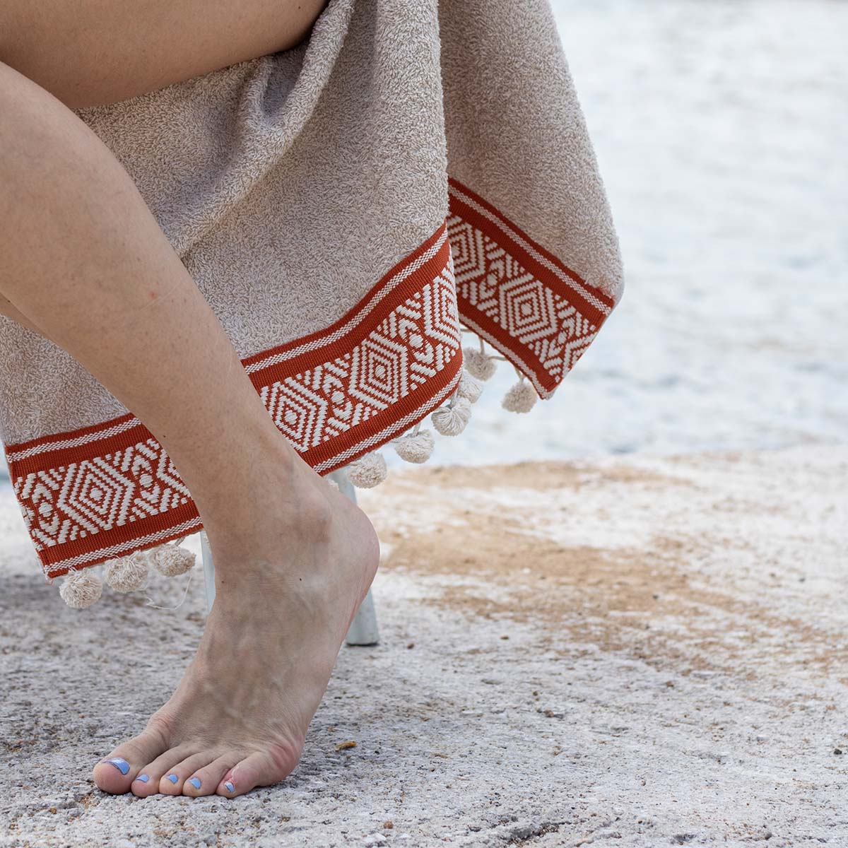 Πετσέτα θαλάσσης από την εταιρεία White Fabric σε μπεζ χρώμα. Διαθέτει υφαντή φάσα με τερακότα λεπτομέρειες και γεωμετρικό σχέδιο. Έχει διακοσμητικά πομ-πομ στο τελείωμα. Είναι κατασκευασμένη από 100% βαμβάκι βάρους 450gsm. Η σύνθεσή της τη καθιστά ιδιαίτερα απαλή και απορροφητική. Επίσης, το βαμβακερό ύφασμα είναι φιλικό στο δέρμα. Μοναδική πετσέτα με ποιότητα και στυλ για τις εμφανίσεις σας στην παραλία.