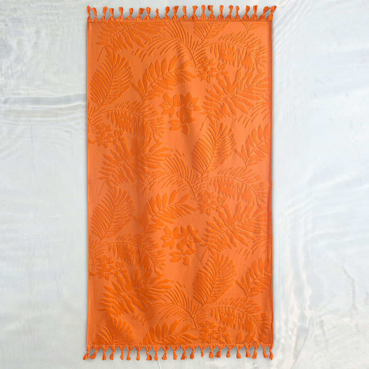 Πετσέτα θαλάσσης σε πορτοκαλί χρώμα, με ανάγλυφο tropical σχέδιο από την εταιρεία Rythmos. Είναι βελουτέ, κατασκευασμένη από 100% αιγυπτιακό βαμβάκι που την καθιστά απαλή και ανθεκτική. Μοναδική πετσέτα με ποιότητα και στυλ για τις εμφανίσεις σας στην παραλία.