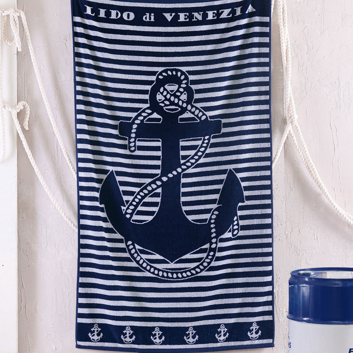 Πετσέτα θαλάσσης σε μπλε χρώμα, με λευκές λεπτομέρειες και ριγέ μοντέρνο σχέδιο από την εταιρεία Rythmos. Είναι βελουτέ, κατασκευασμένη από 100% αιγυπτιακό βαμβάκι που την καθιστά απαλή και ανθεκτική. Μοναδική πετσέτα με ποιότητα και στυλ για τις εμφανίσεις σας στην παραλία.