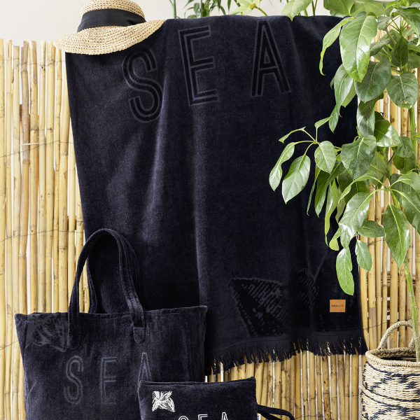 Πετσέτα θαλάσσης σε μαύρο χρώμα από την εταιρεία Nima. Έχει ανάγλυφο σχέδιο και κρόσια. Η σύνθεσή της είναι 100% βαμβάκι ζακάρ 420gsm που την καθιστά απορροφητική και ανθεκτική. Η μία πλευρά της είναι βελουτέ για απαλότητα και η άλλη είναι πετσετέ για απορροφητικότητα. Μοναδική πετσέτα με ποιότητα και στυλ για τις εμφανίσεις σας στην παραλία.