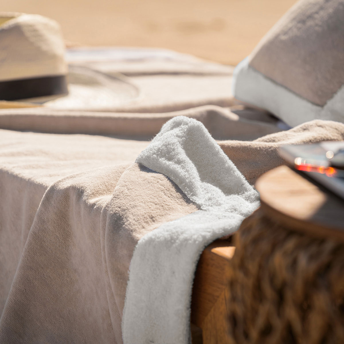 Πετσέτα θαλάσσης από την εταιρία Gofis Home σε μπεζ χρώμα και εκρού μπορντούρα. Είναι κατασκευασμένο από βελουτέ ύφασμα σύνθεσης 100% βαμβάκι βάρους 450gsm που προσφέρει απαλότητα. Μοναδική πετσέτα θαλάσσης με ποιότητα και στυλ για τις εμφανίσεις σας στην παραλία.