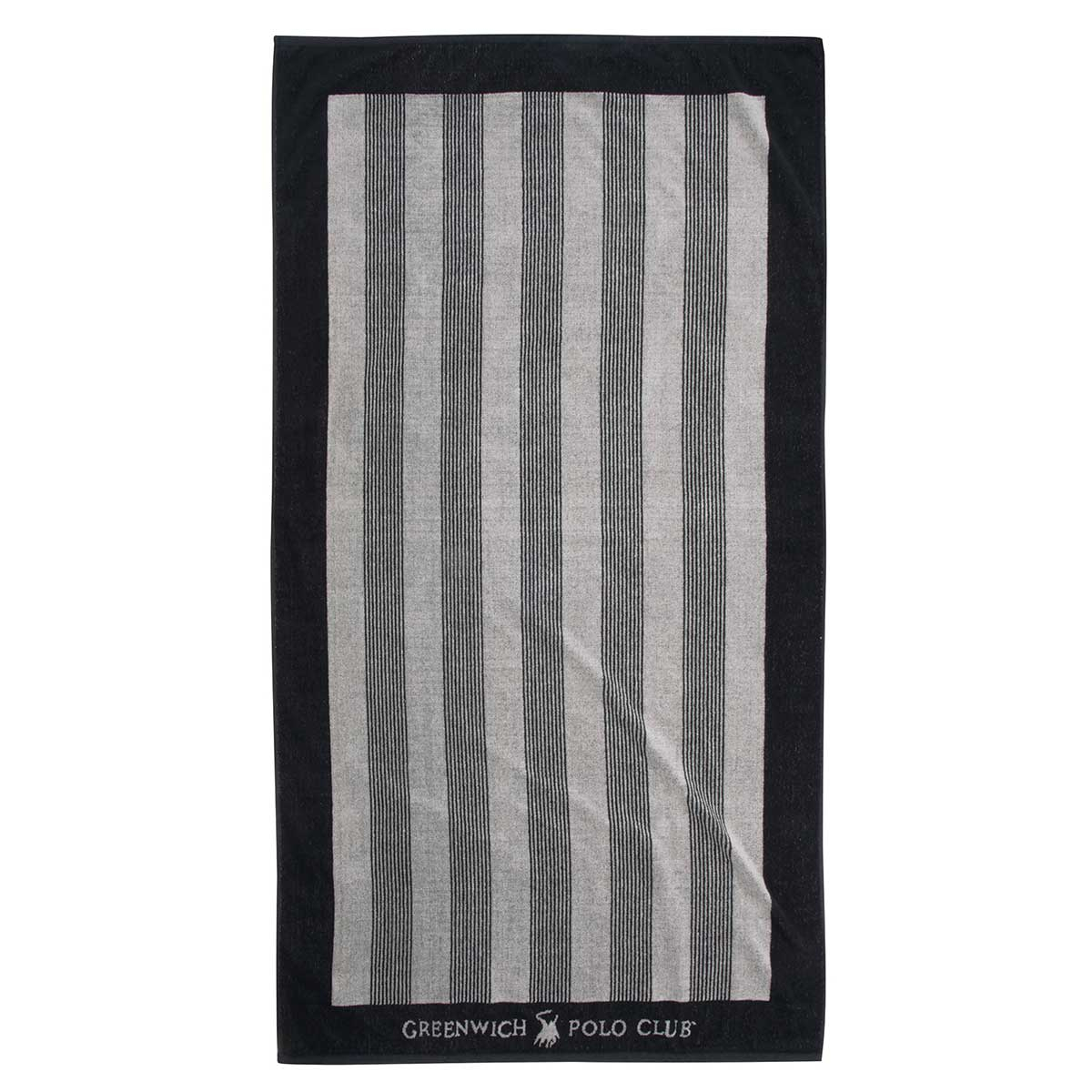Πετσέτα θαλάσσης από τον οίκο Greenwich Polo Club που προσφέρει ποιότητα, στυλ και πολυτέλεια. Έχει γκρι χρώμα με μαύρες λεπτομέρειες και ριγέ σχέδιο. Είναι κατασκευασμένη από 100% υποαλλεργικό βαμβάκι σε ύφανση jacquard 400 gsm. Μοναδική πετσέτα με ποιότητα και στυλ για τις εμφανίσεις σας στην παραλία.