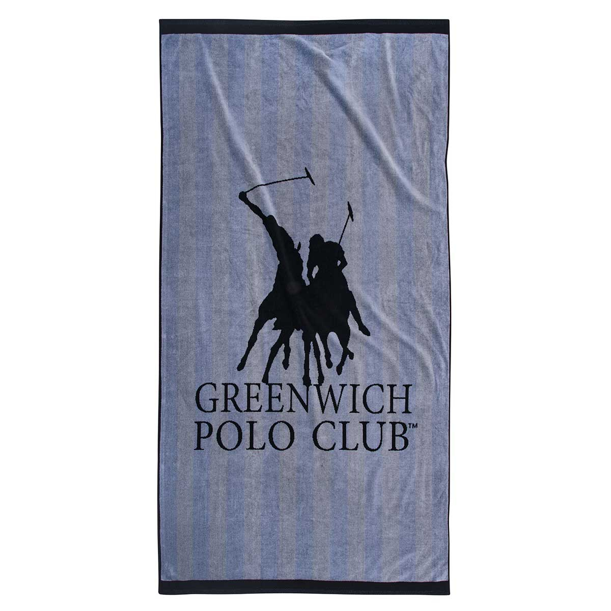 Πετσέτα θαλάσσης σε γκρι χρώμα, με γαλάζιες λεπτομέρειες ριγέ σχέδιο και το λογότυπο του οίκου Greenwich Polo Club. Είναι κατασκευασμένη από 100% υποαλλεργικό βαμβάκι σε ύφανση jacquard, βάρους 400 gsm το οποίο την καθιστά απαλή και ανθεκτική. Μοναδική πετσέτα με ποιότητα και στυλ για τις εμφανίσεις σας στην παραλία.