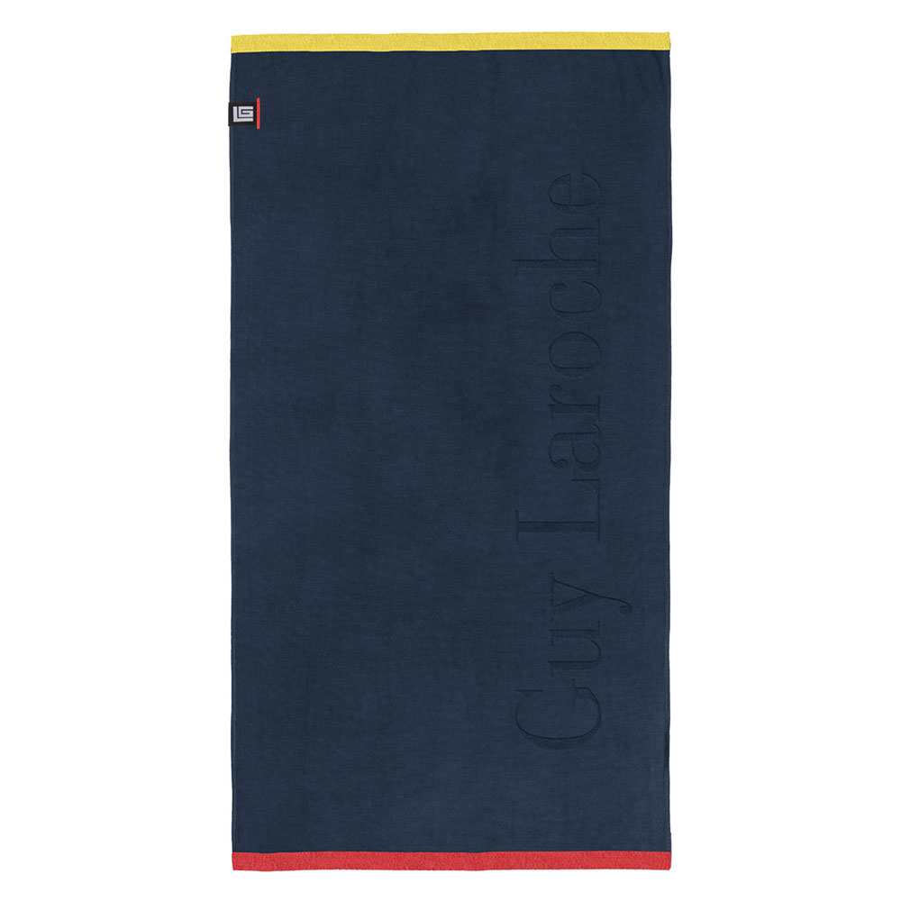 Πετσέτα θαλάσσης σε μπλε χρώμα με κίτρινες-κόκκινες λεπτομέρειες από την εταιρεία Guy Laroche. Με βελουτέ ύφασμα από 100% βαμβάκι που την κάνει αρκετά απαλή και απορροφητική.