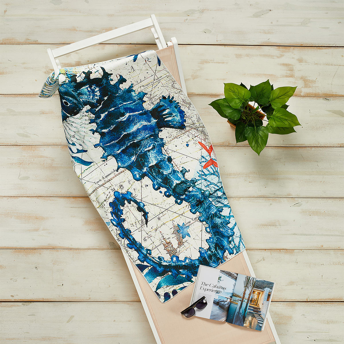 Πετσέτα θαλάσσης με καλοκαιρινό σχέδιο σε μπλε αποχρώσεις με εκρού-μπεζ λεπτομέρειες από την εταιρεία Whitegg. Είναι κατασκευασμένη από 100% polyester με υπέρ απορροφητική σύνθεση. Δεν κολλάει η άμμος πάνω της, είναι ελαφριά και στεγνώνει γρήγορα. Ιδανική λύση για στιλάτες εμφανίσεις στην παραλία, με ποιότητα και άνεση.