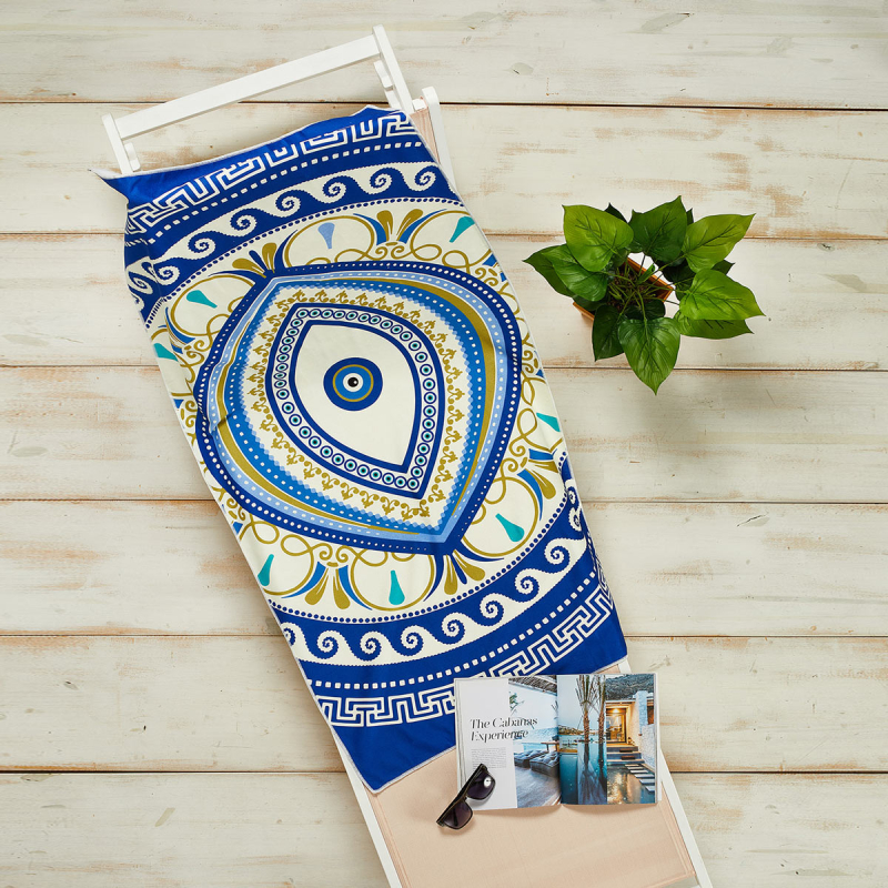 Πετσέτα θαλάσσης σε μπλε αποχρώσεις με εκρού-μουσταρδί λεπτομέρειες και μοντέρνο σχέδιο από την εταιρεία Whitegg. Είναι κατασκευασμένη από 100% polyester με υπέρ απορροφητική σύνθεση. Δεν κολλάει η άμμος πάνω της, είναι ελαφριά και στεγνώνει γρήγορα. Ιδανική λύση για στιλάτες εμφανίσεις στην παραλία, με ποιότητα και άνεση.