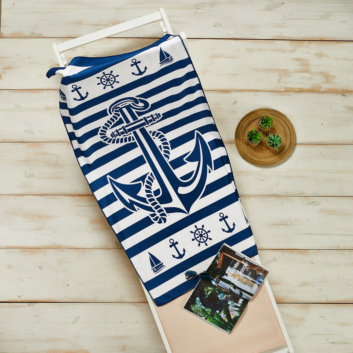 Πετσέτα θαλάσσης με μοντέρνο σχέδιο σε μπλε-λευκό χρώμα από την εταιρεία Whitegg. Είναι κατασκευασμένη από 100% polyester με υπέρ απορροφητική σύνθεση. Δεν κολλάει η άμμος πάνω της, είναι ελαφριά και στεγνώνει γρήγορα. Ιδανική λύση για στιλάτες εμφανίσεις στην παραλία, με ποιότητα και άνεση.