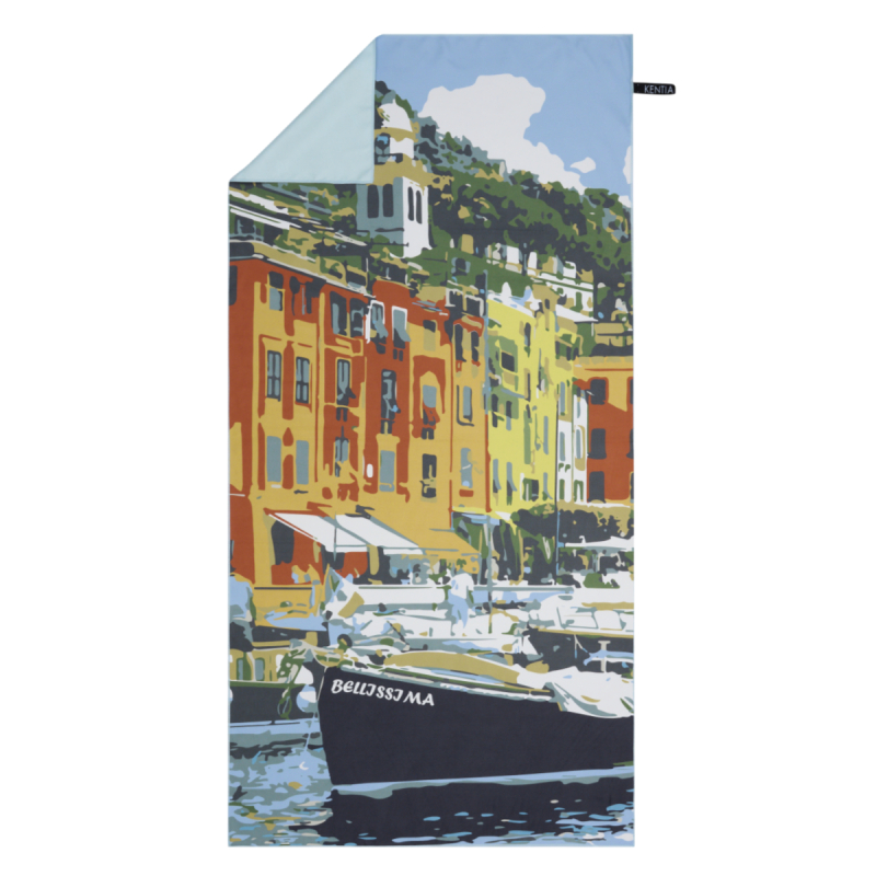 Πετσέτα μικροϊνών διπλής όψης από την εταιρεία Kentia. Η μία μεριά έχει μοντέρνο σχέδιο σε πολύχρωμες αποχρώσεις ενώ η άλλη μεριά είναι μονόχρωμη σε βεραμάν χρώμα. Είναι κατασκευασμένη από microfiber σύνθεσης 80% polyester και 20% πολυαμίδιο με βάρος 190gsm. Είναι απαλή, ελαφριά, υπέρ-απορροφητική και στεγνώνει γρήγορα. Είναι ιδανική επιλογή ως πετσέτα θαλάσσης, πετσέτα γυμναστηρίου, και γενικά ως πετσέτα για κάθε αθλητική δραστηριότητα.