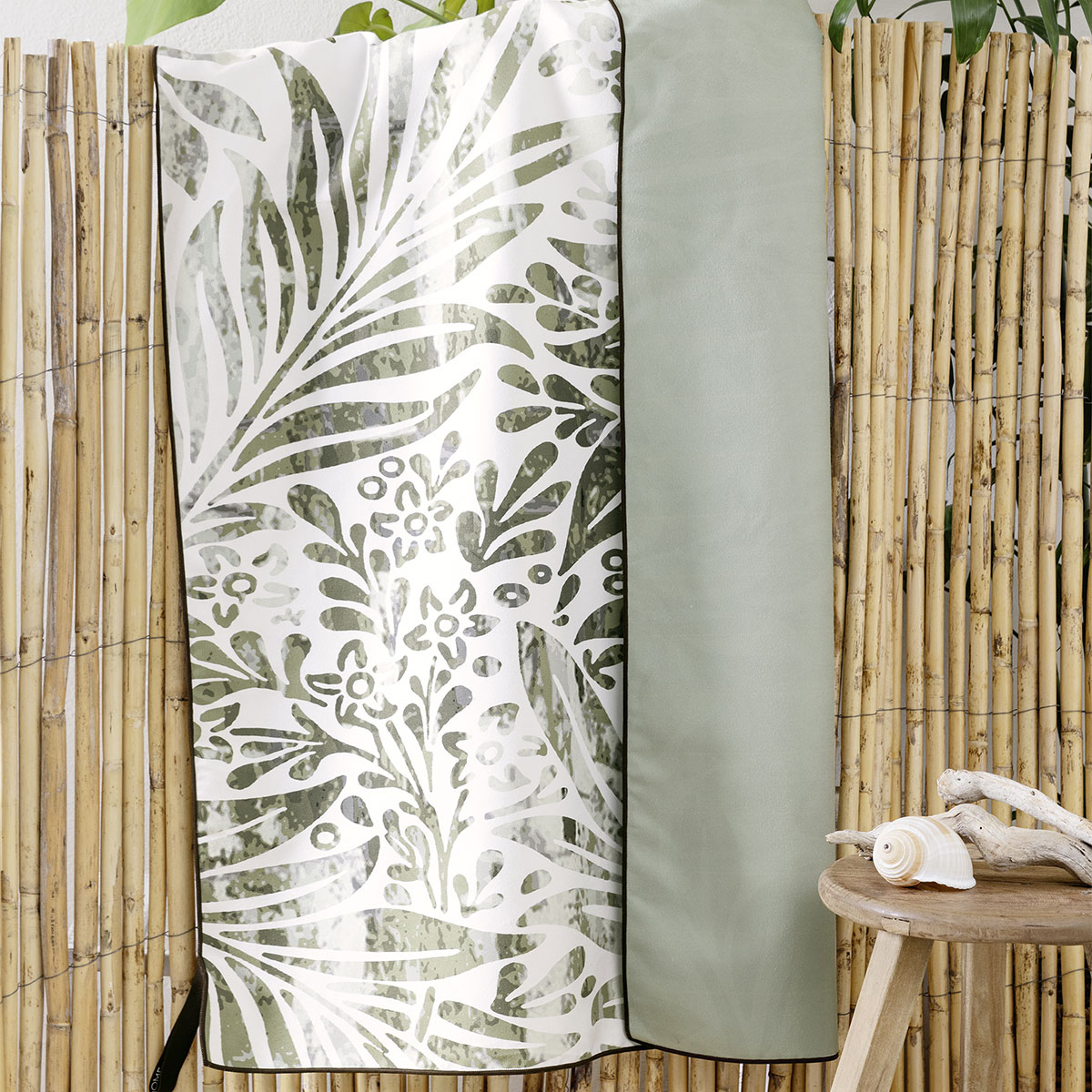 Πετσέτα μικροϊνών σε εκρού φόντο, με χακί λεπτομέρειες και tropical σχέδιο από την εταιρεία Nima. Η άλλη πλευρά είναι μονόχρωμη γκρι. Είναι κατασκευασμένη από 100% microfiber που την καθιστά ελαφριά και υπέρ-απορροφητική και στεγνώνει γρήγορα. Είναι ιδανική επιλογή ως πετσέτα θαλάσσης.
