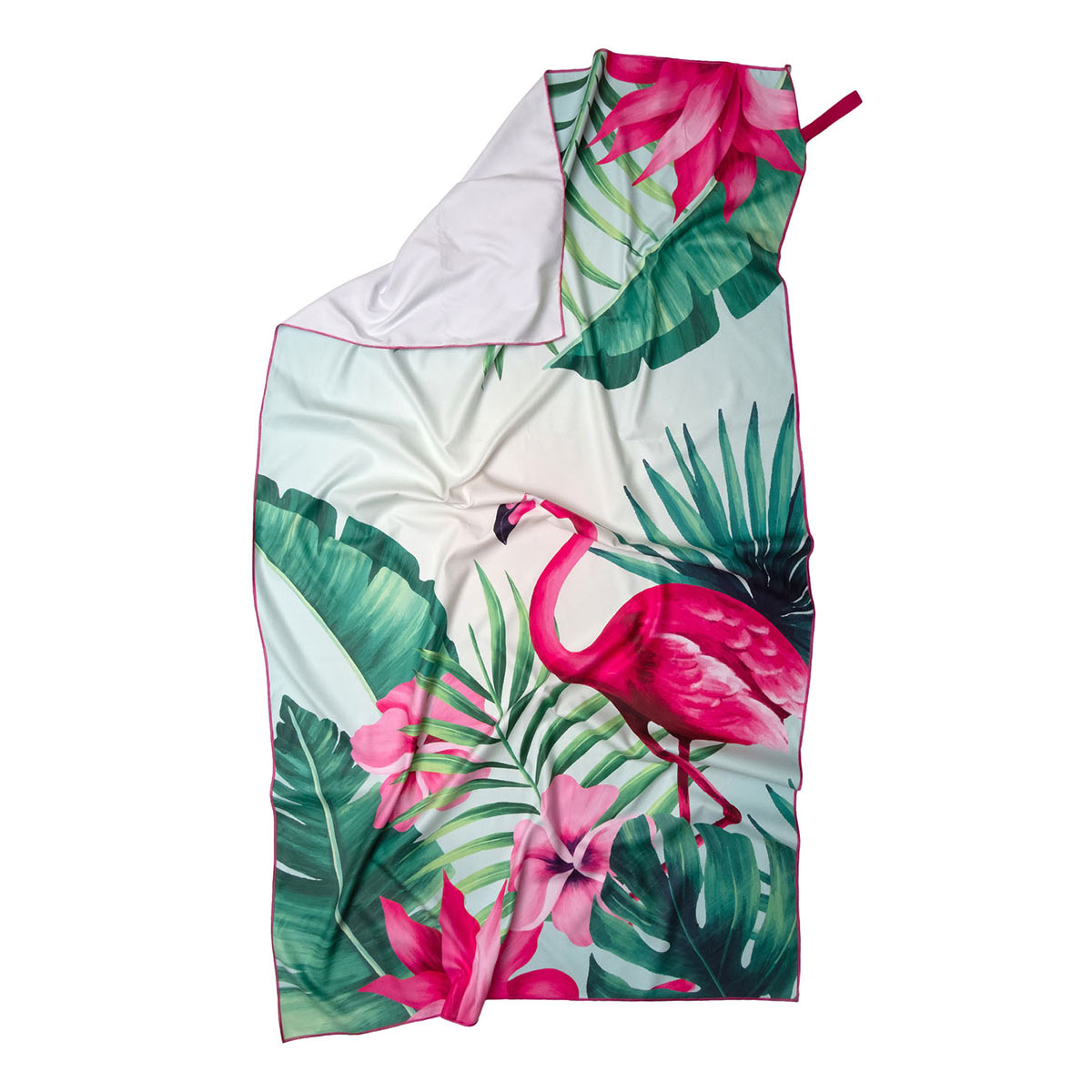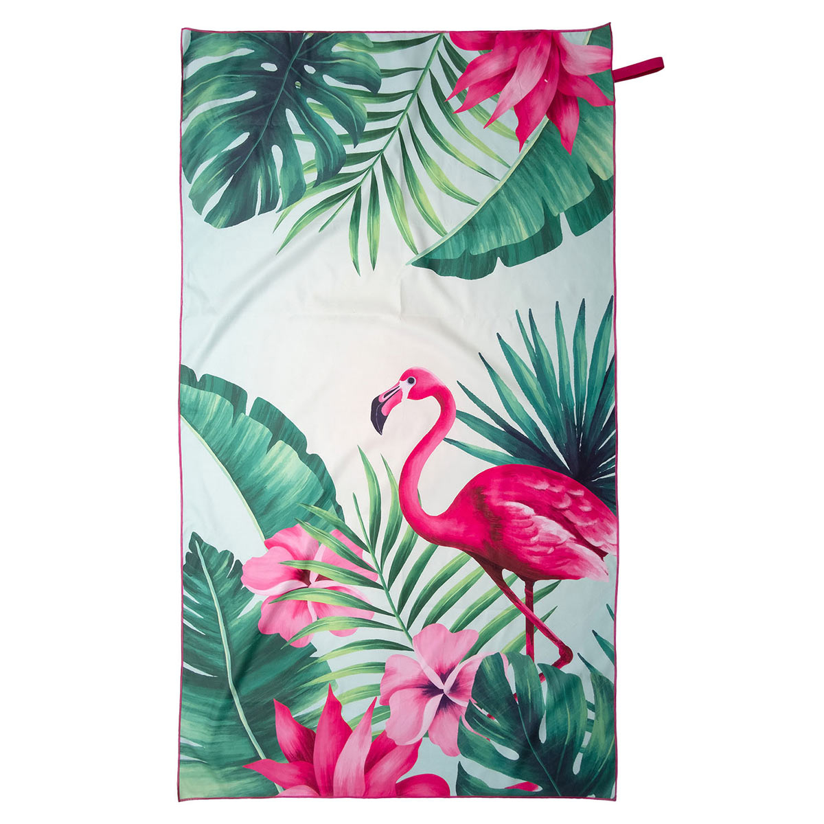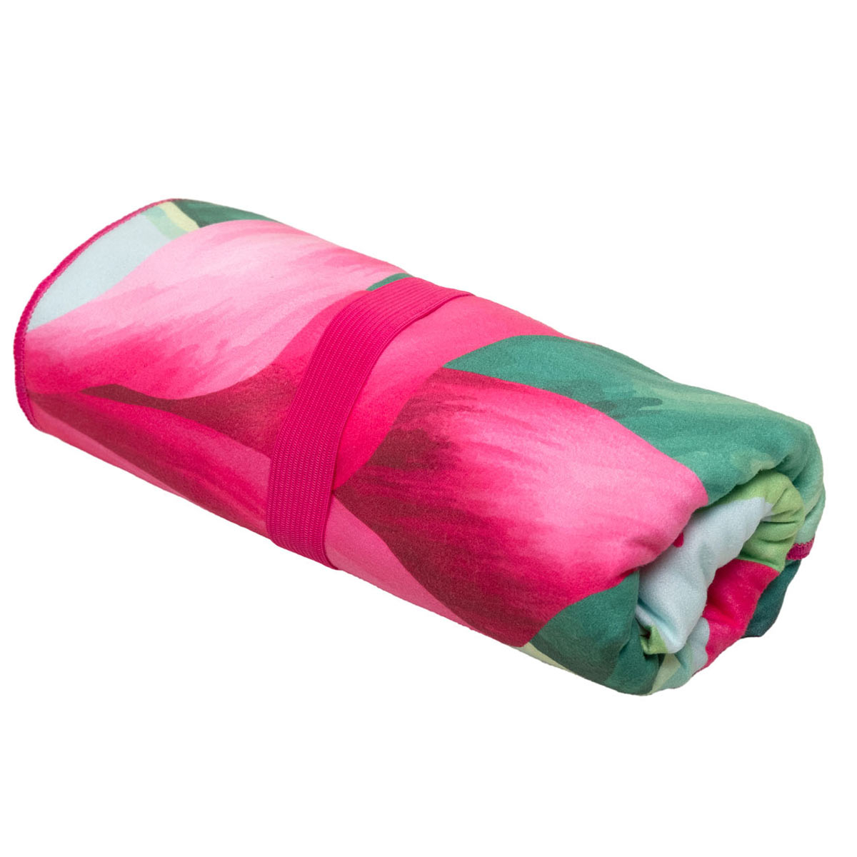 Πετσέτα θαλάσσης σε πράσινες-φούξια αποχρώσεις και tropical σχέδιο τυπωμένο με την μέθοδο της ψηφιακής εκτύπωσης από την εταιρεία Viopros. Είναι κατασκευασμένη από 100% microfiber που την καθιστά πολύ ελαφριά και υπερ-απορροφητική. Στεγνώνει γρήγορα και δεν κολλάει η άμμος πάνω της. Διαθέτει λάστιχο για να μένει διπλωμένη. Ιδανική επιλογή για την παραλία.