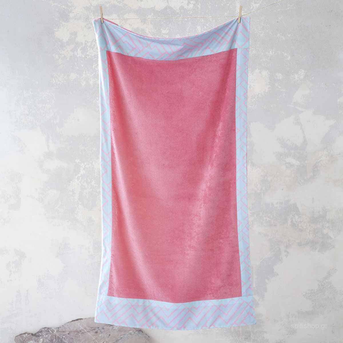 Πετσέτα θαλάσσης από την εταιρεία Nima με υφασμάτινη φάσα γεωμετρικού σχεδίου. Η σύνθεσή της είναι 100% βαμβάκι σε φούξια χρώμα και η περιμετρική φάσα είναι γαλάζια. Συνδυάστε το με το ασορτί τσαντάκι, και ολοκληρώστε την εμφάνισή σας για την παραλία.